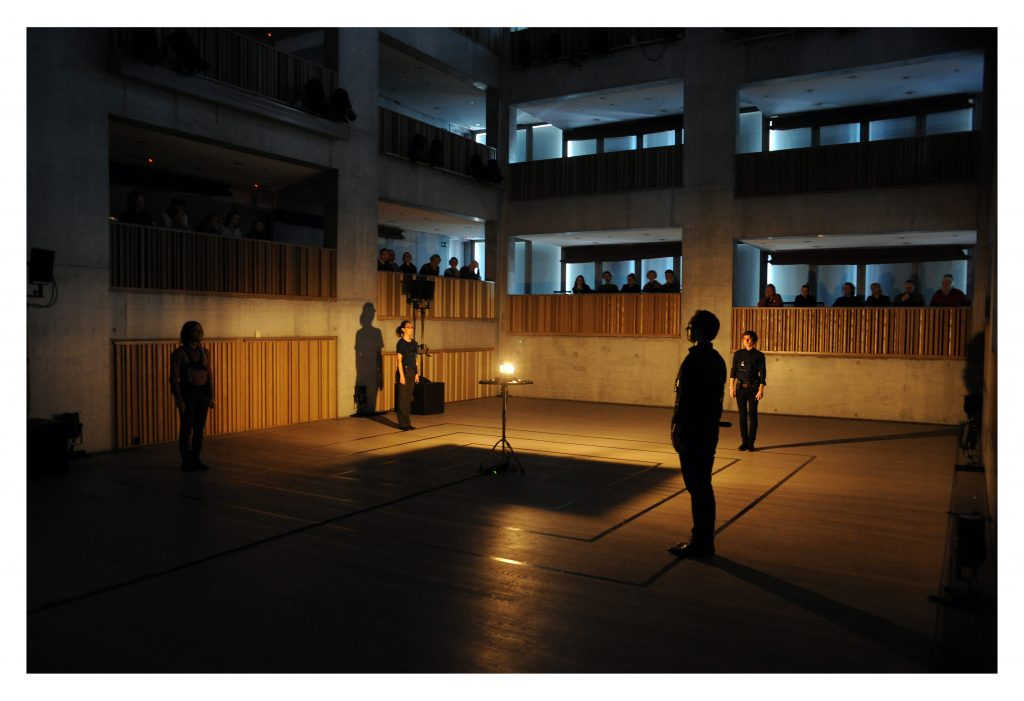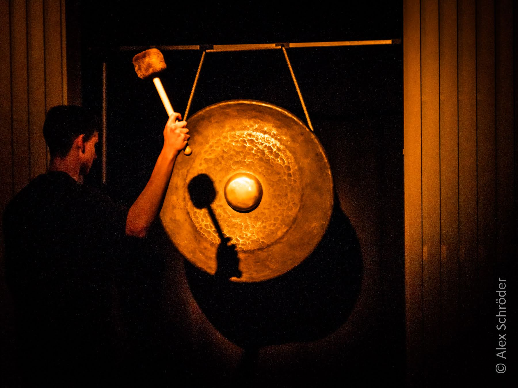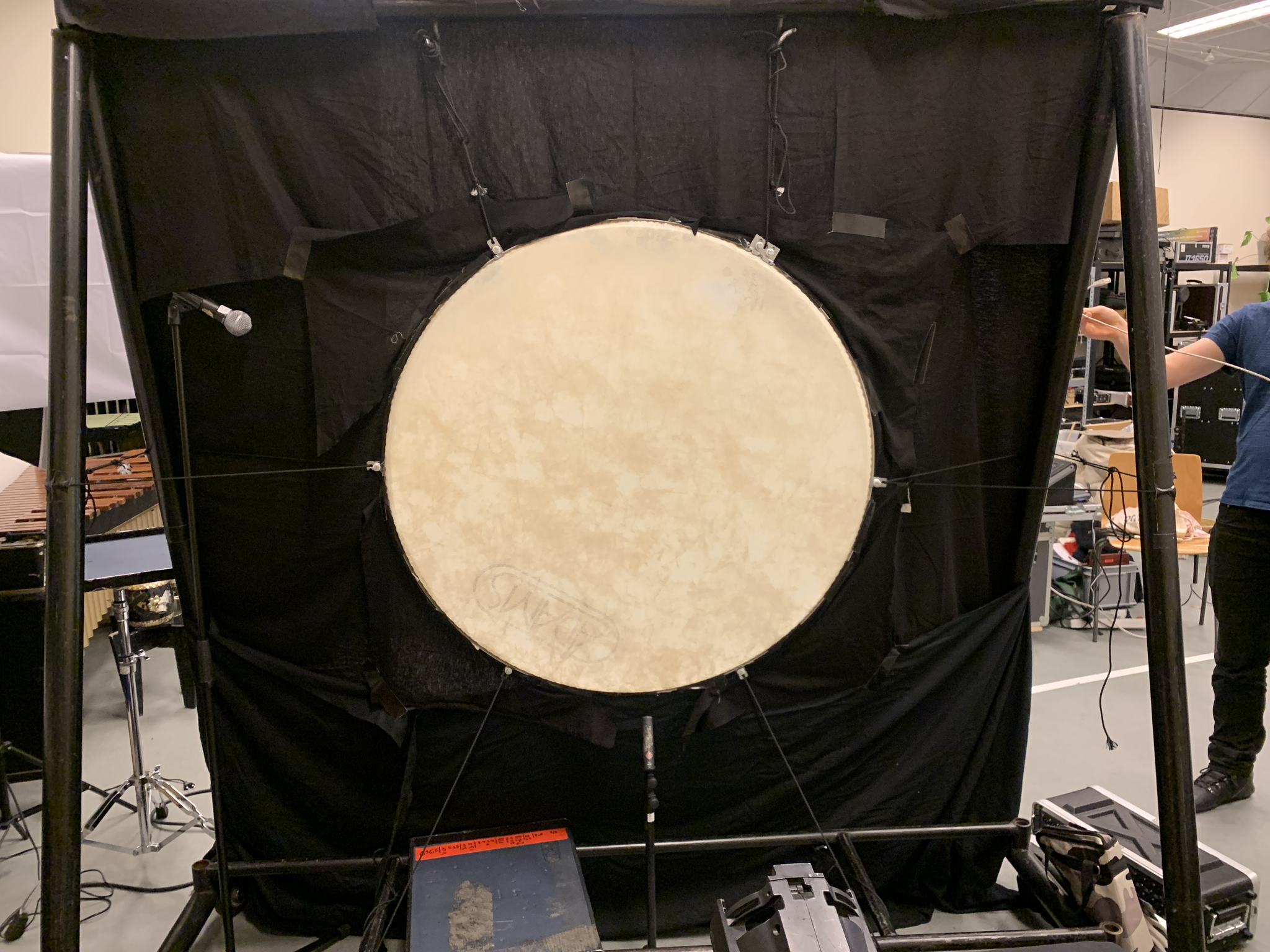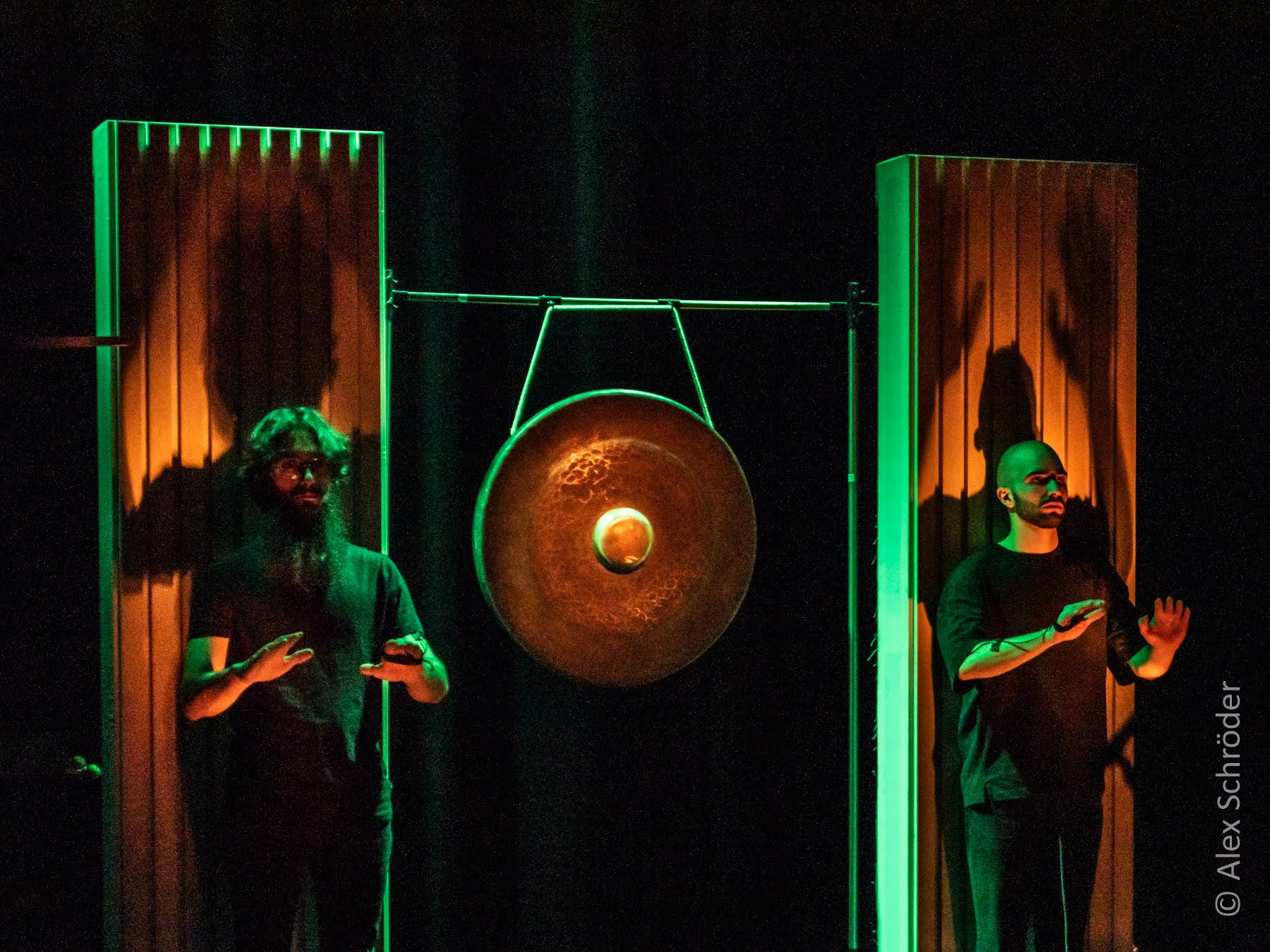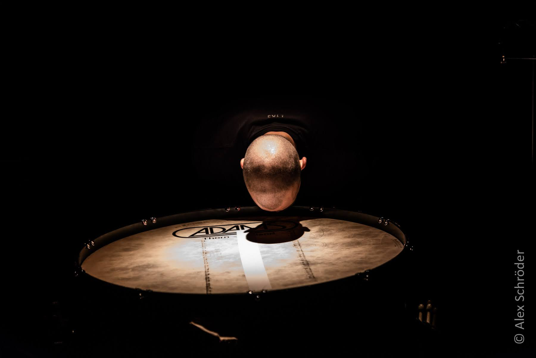 The setup included a bass drum skin suspended vertically on a large tam-tam frame, acting as a screen for shadow play. A contact microphone attached to the bottom captured the sound of hands striking the drum skin. The piece is divided into three parts. The first introduces the performers’ faces and hand gestures with alternating light on and off, creating a mysterious visual atmosphere without sound. In the second part, the performers begin to produce rhythms and patterns by striking the drum skin, guided by choreographed movements. The final section adds a second layer of blue light, representing the moon, as the sound is enriched with live electronic effects and a photoresistor-connected oscillator, generating raw, textured sounds.