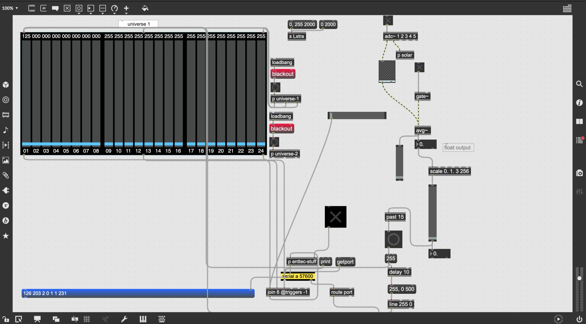 Developing real-time interactions between DMX lighting and musicians.