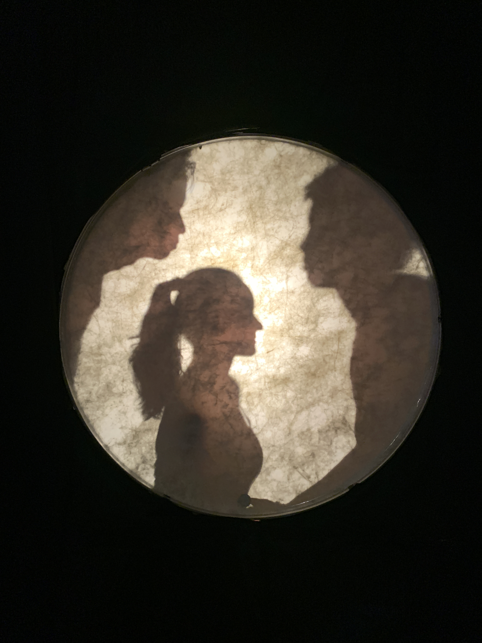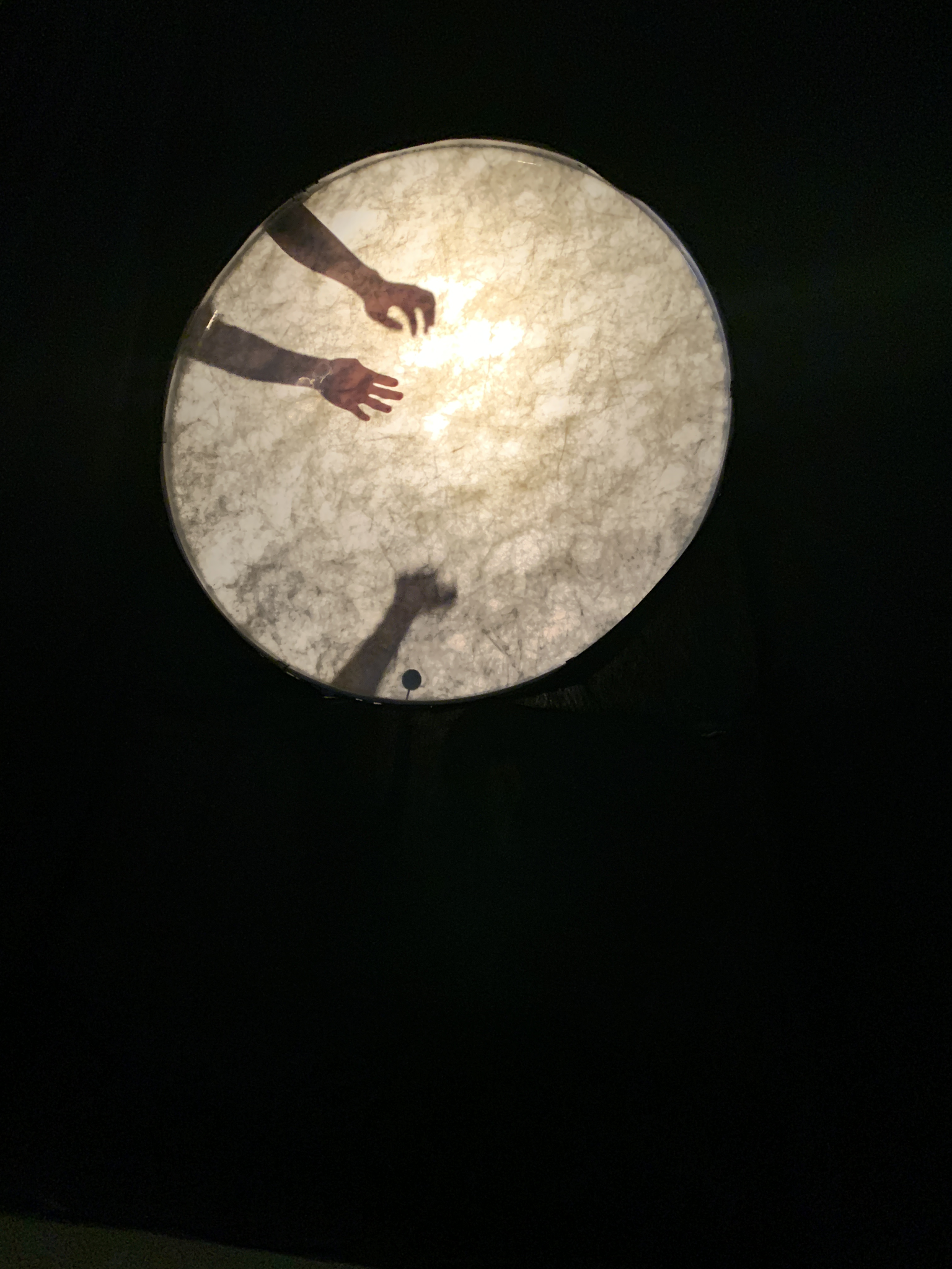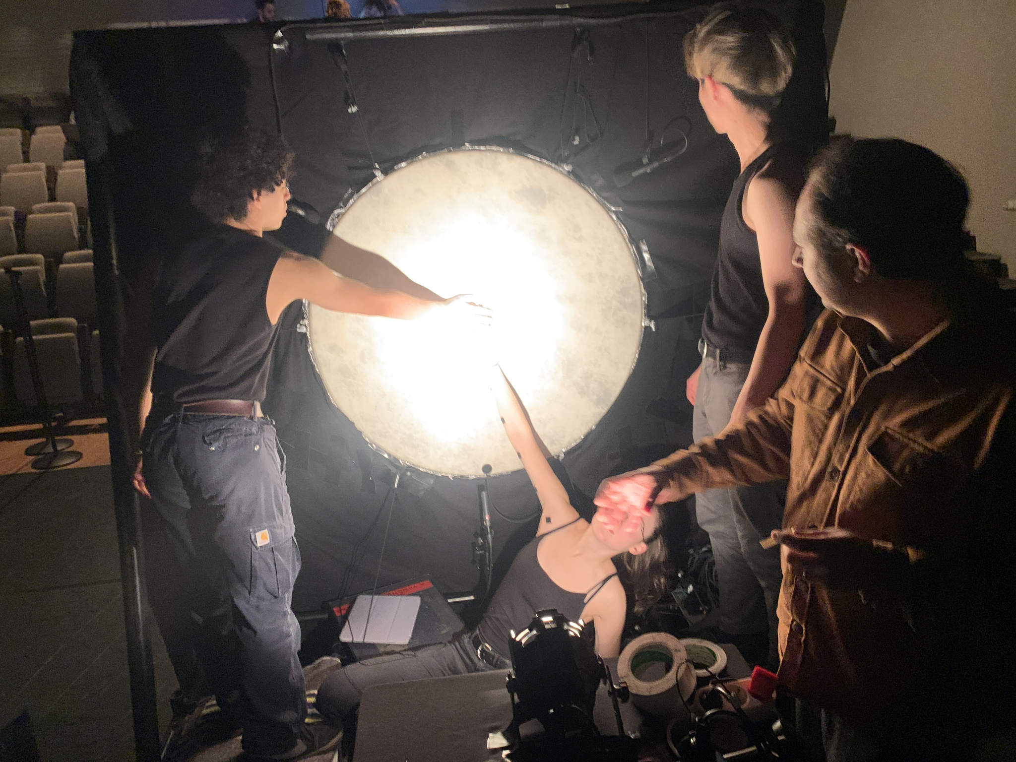 The light design for "Shadows in Three" was simple but intentional, using two light sources: a yellowish spotlight connected to a dimmer and a circular LED light set to blue. These lights played distinct roles in shaping the mood and guiding the narrative of the performance. The yellow spotlight highlighted the performers’ hand movements and facial structures, creating sharp contrasts and vivid shadows on the bass drum skin. This interplay of light and shadow directly informed the audience where the sound originated, enhancing the sound-visual connection.