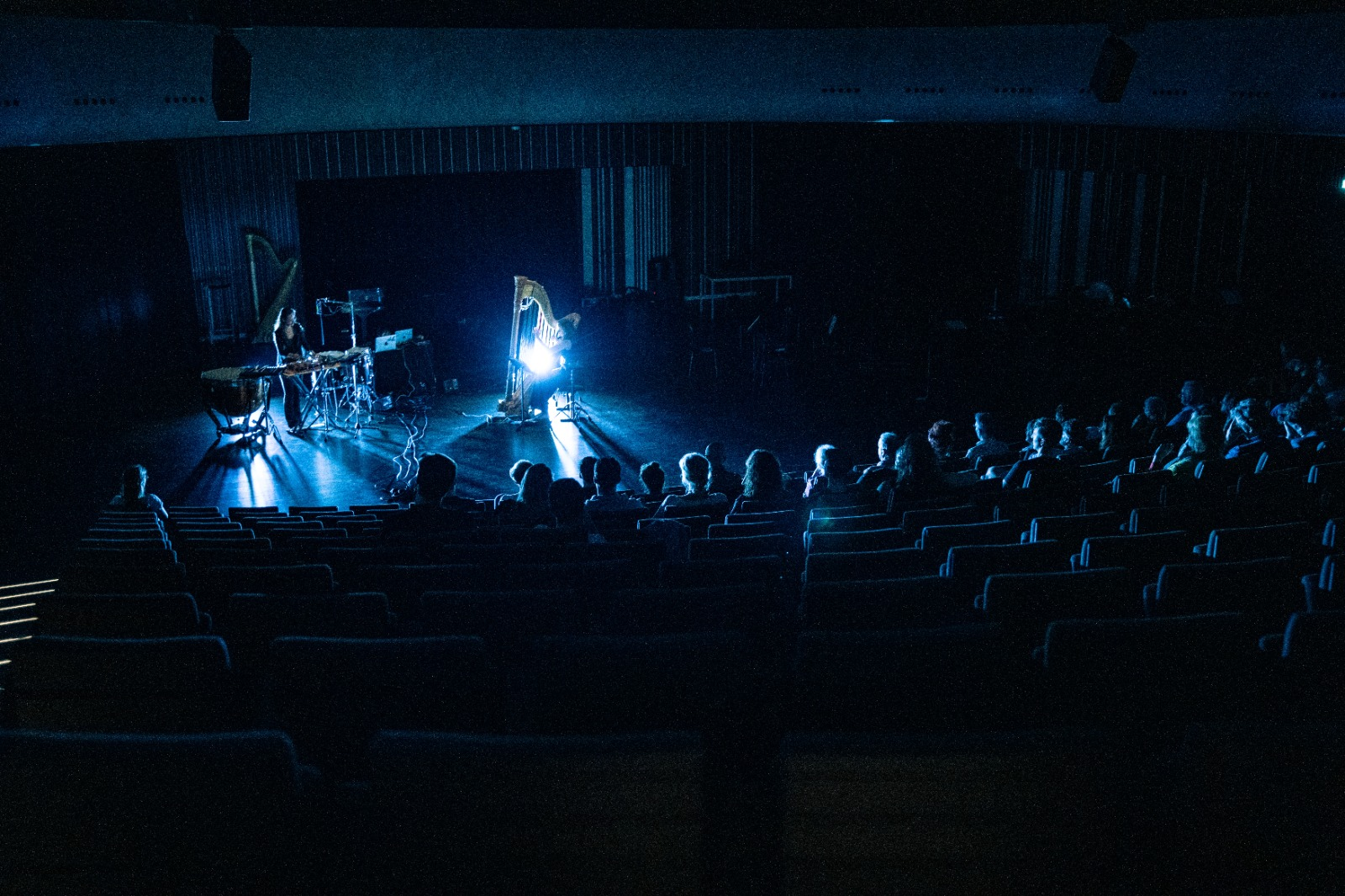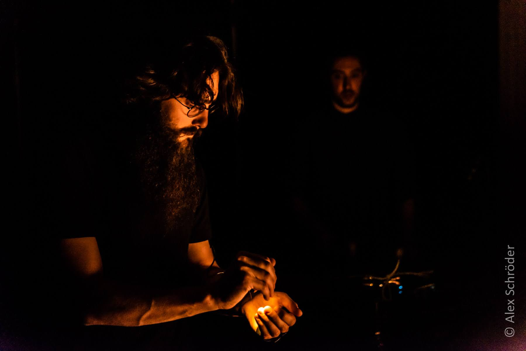 The first movement is characterized by minimal light, emphasizing silence and subtle sounds. The stage is mostly dark, with only a faint glow from an LED candle. This movement is about sound exploration and serves as a listening session for the audience. The oscillators and other percussion instruments, such as vibraphones, wooden sticks, and singing bowls, create delicate pulses that invite the audience to focus on the nuances of the sounds. The low light level guides the audience's attention, creating a sense of anticipation and intimacy.