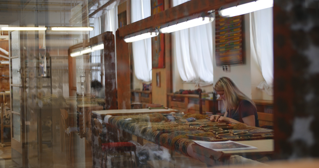 či zvukem jsem se považoval (a stále trochu považuji) za amatéra. Štítem byla zkratka DIY a kopím neškolená intuice. Také do manufaktury jsem vstupoval sám z nouze. Předcházelo mu natáčení výstavy v Muzeu města Olomouc, které mi na poslední chvíli odřekl kameraman. Následně nastala covidová izolace. Předpokládal jsem zprvu, že do gobelínky půjdu sám hlavně na rešerše, observovat se svou první, stařičkou GH4. Záběry měly