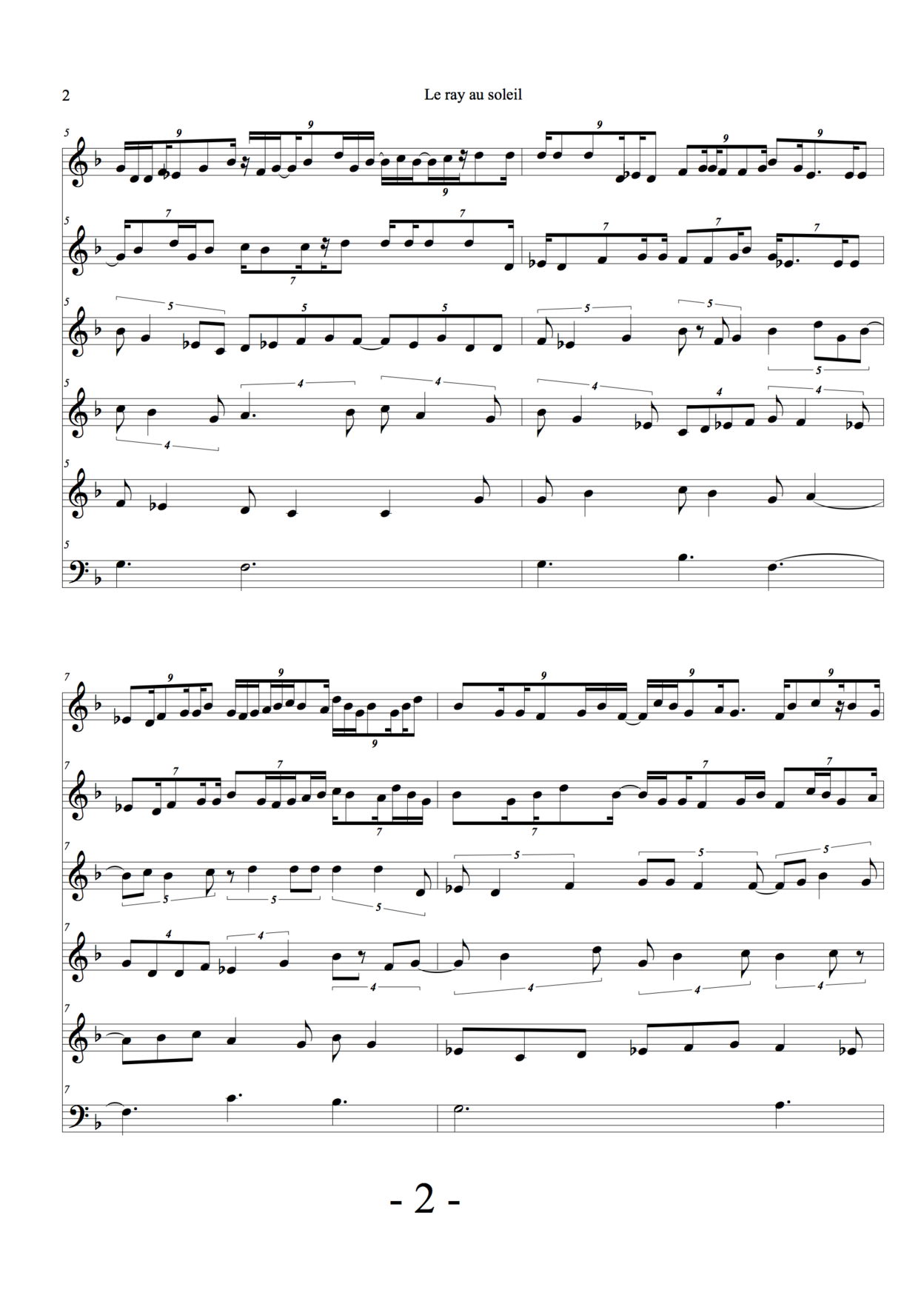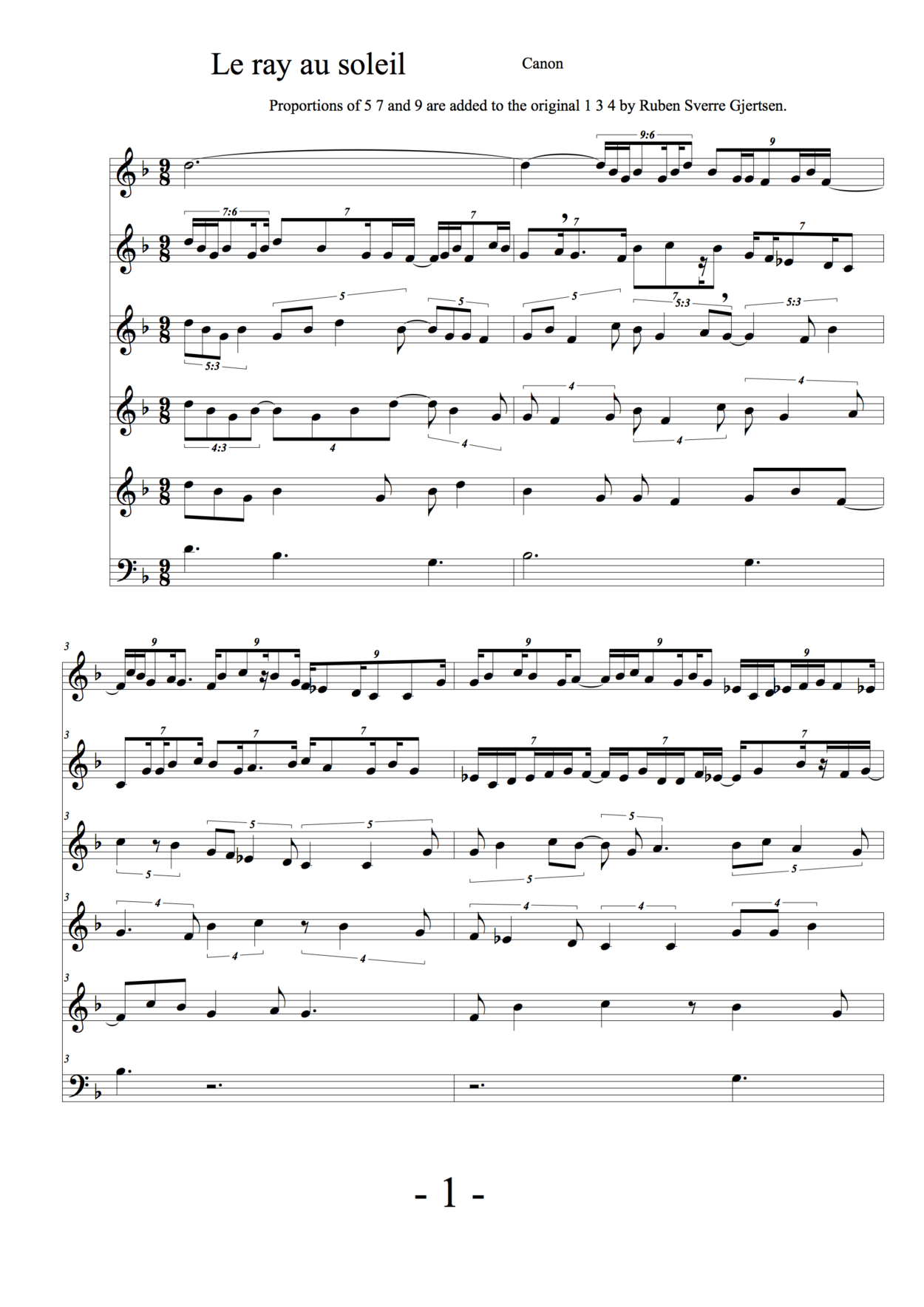 I extended Ciconias 3-part canon to 6 parts by adding new proportions. Some sustained drones were added before or after where durations could not add up. This version will step outside medieval counterpoint principles, a canon in the speed ratios 1:3:4:5:7:9. For practical reasons, it has been transposed to G (concert pitch 465 Hz).