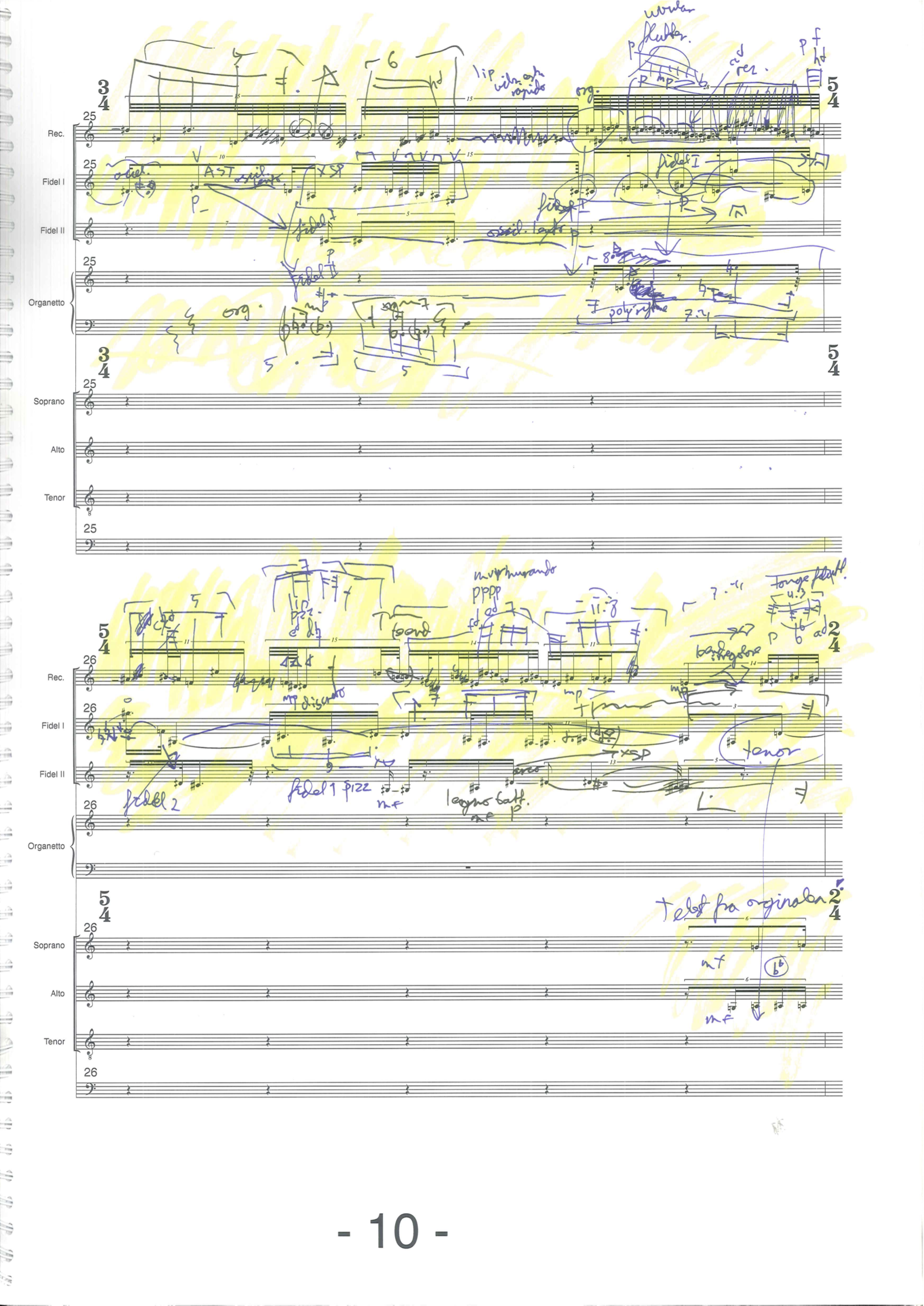 • Interpretations, attempts to make musical sense of these materials. The distortions were often unplayable and had less focus in harmony and interval colours than I prefer. Pitches were changed, notes were redistributed between musicians, and missing dimensions of timbre, vibrato type, playing techniques and dynamics were added. These are not results of special compositional techniques, rather palettes of gestures and sounds and shapings of the musical surface. Yellow means "done" and edited in the notation software.