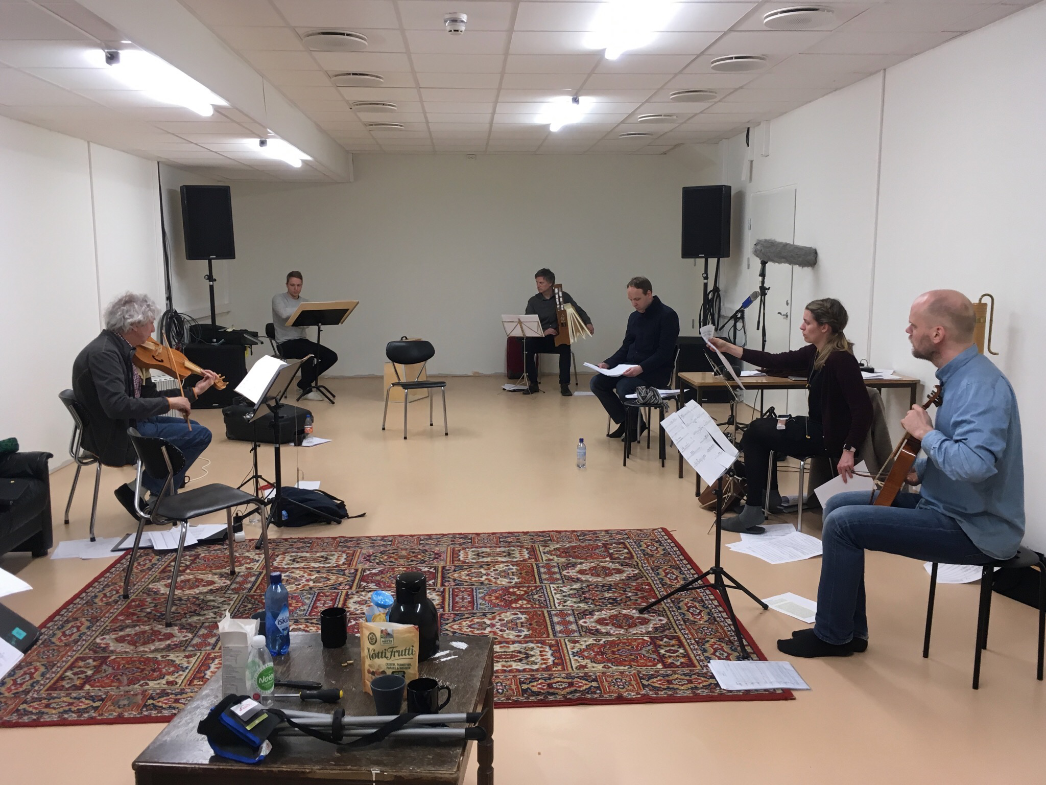 Rehearsal of "Nuper rosarum flores" at WRAP, Bergen. From left to right: Hans Lub, Kjetil Almenning, Hans Knut Sveen, Ruben Sverre Gjertsen, Ingvill Holter, Mikko Perkola.
