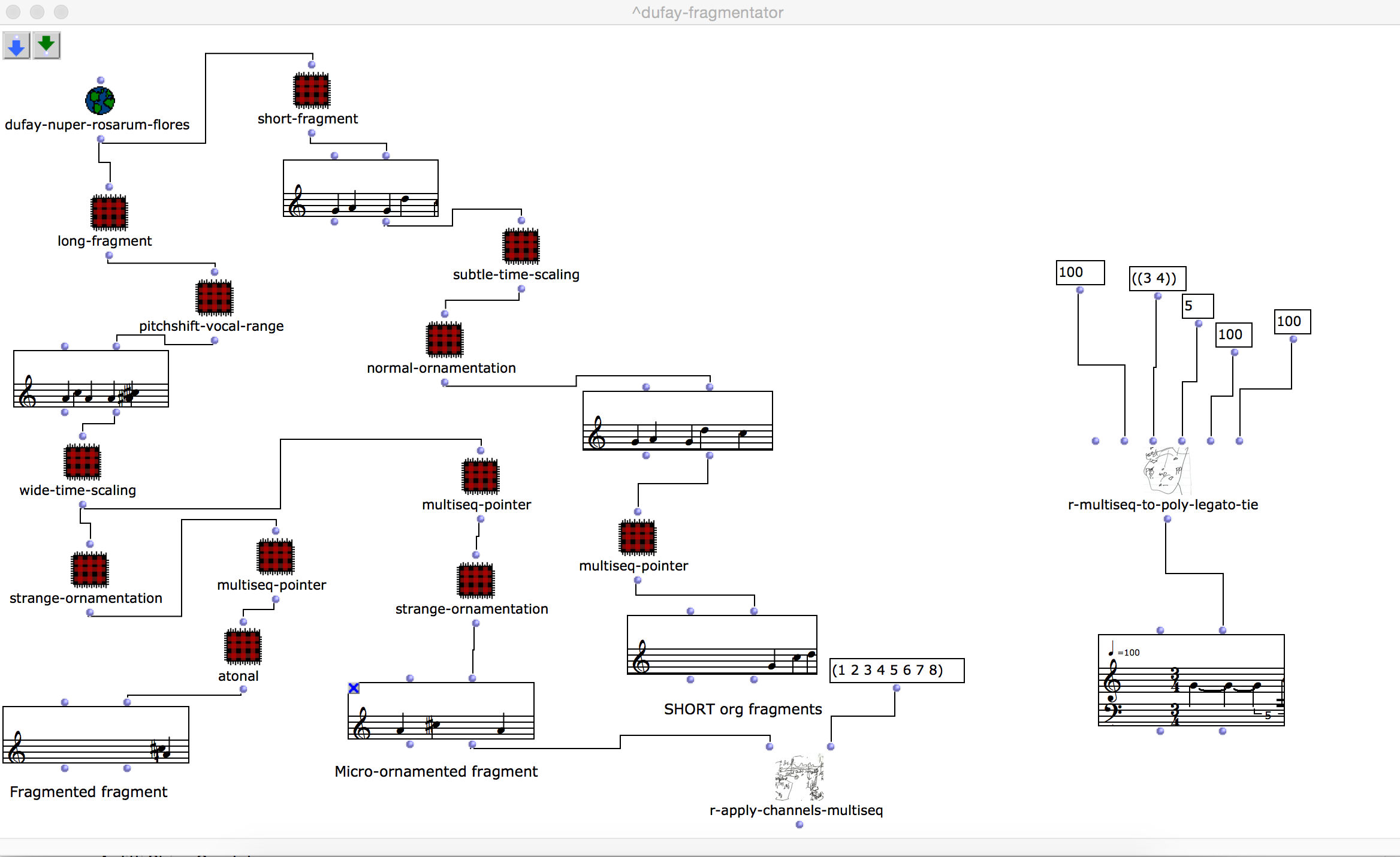 "Nuper rosarum flores" became the most precisely notated work in our concert. We have already seen "Nuper rosarum flores" going through the ornamentation machine. This was one of the initial procedures for the materials. Further processes disrupted the continuity of time and pitch space. The OM-Ruben library  contains transformation tools which can be connected in any order through patch chords. Three main types of Dufay-distortions were created.