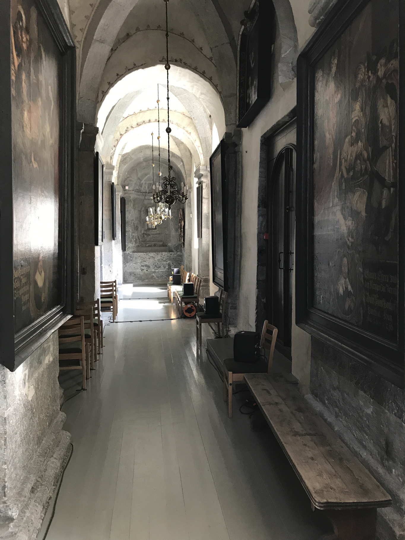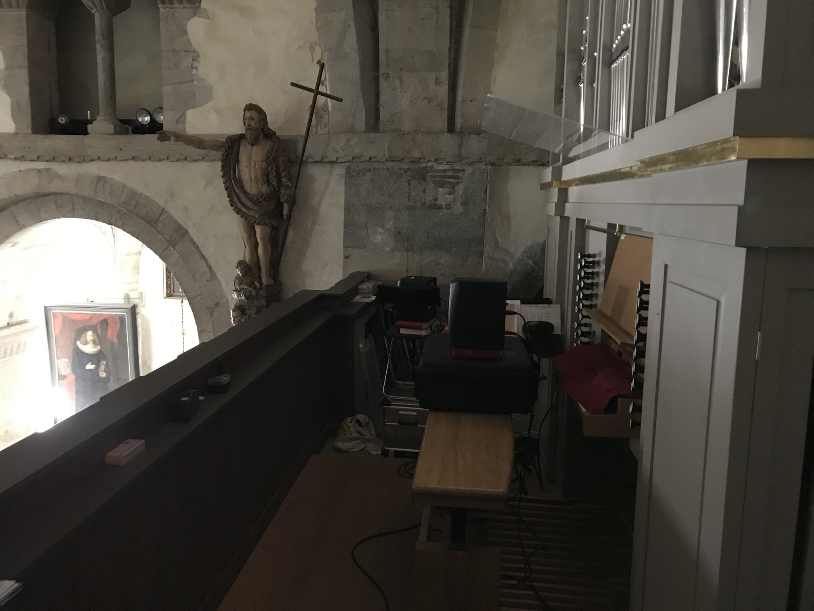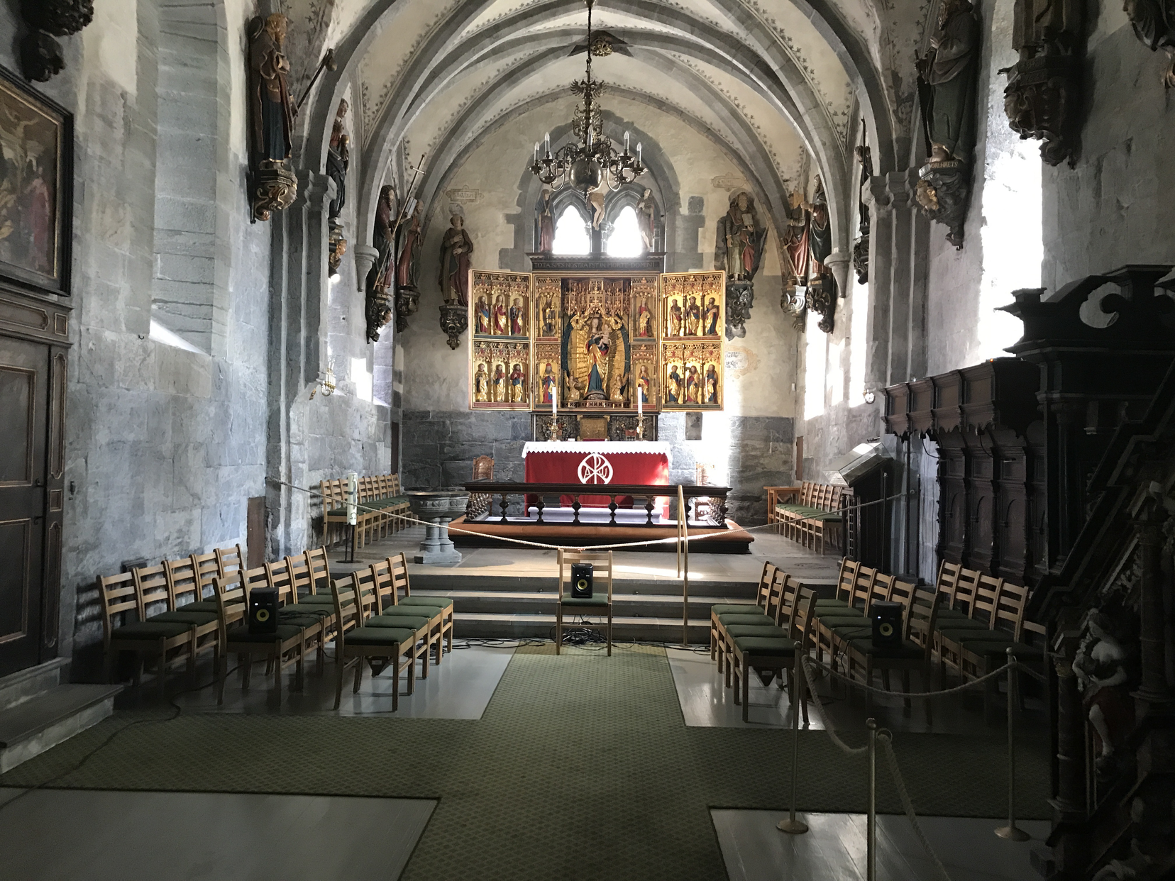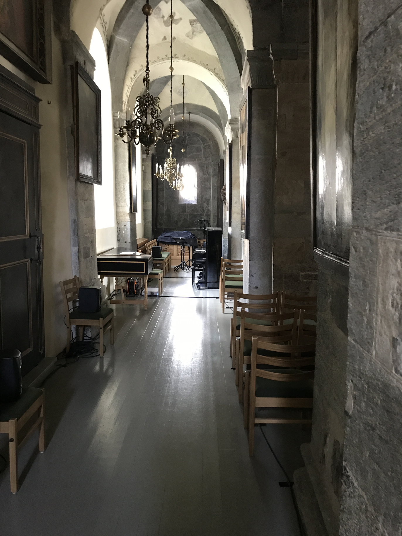 Mariakirken, the oldest building in Bergen, is a more irregular space than Håkonshallen. The "Mouvance I: Mass" concert took place here. I searched for optimal speakers positions, and ended up with similar a setup to what we did in Håkonshallen; 3 speakers in front of the altar, 5 speakers along the side walkways, behind the columns at each side, 3 speakers at the organ gallery. For most seats in the church, some speakers would be behind columns, projecting indirectly.