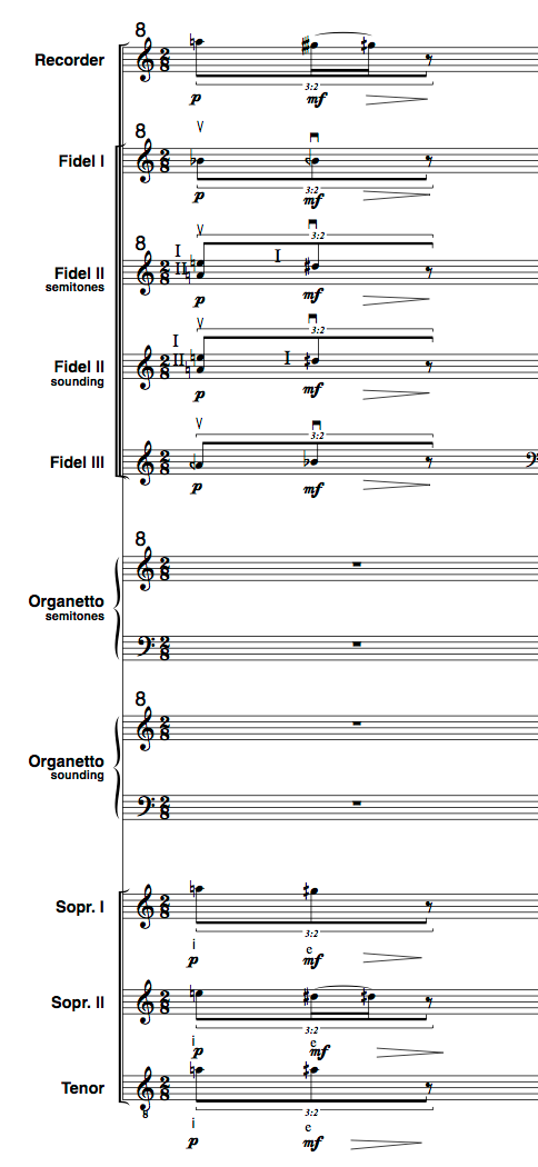 Rather than getting a resolution, the microtonal leading notes are left hanging. I may well etablish my own rules for a microtonal language. Semitones are strongly associated with tonal leading notes, 1/4-tones, 3/4-tones and whole tones much less so. At the first open fifth, fidel 1 adds 'b flat', which is a semitone away from the 'a', but the 'a quarter flat' disturbs this relation. The 1/4-tone and 3/4-tone intervals make the semitone less problematic. The middle leading note chord contains as many 1/4-tone dissonances as possible.