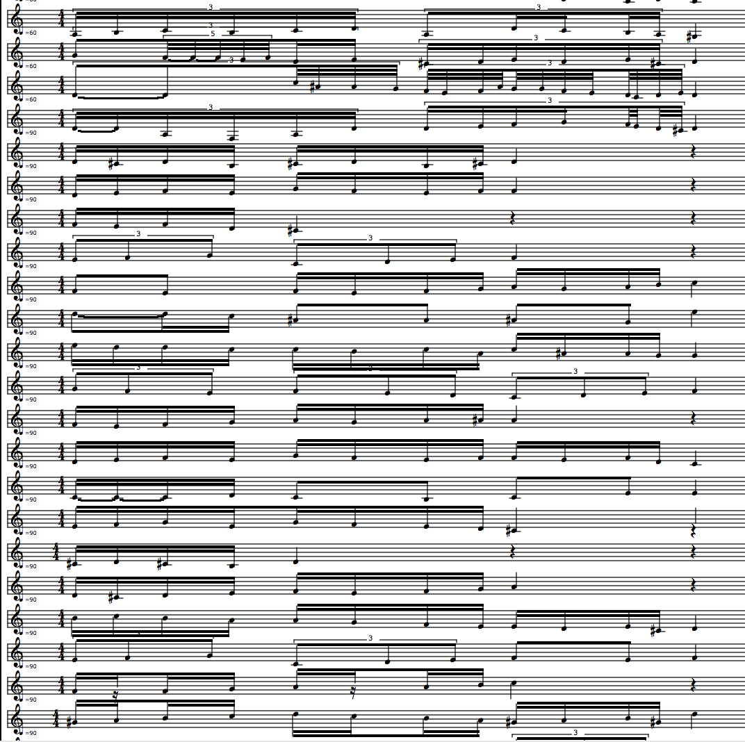 Curve shapes can emulate a musician shaping the tendencies through a piece of music. This ornamentation method is not sensitive to mode, and does not match ornamentation figures to steps in a scale. This would be necessary to create stylistic ornamentations. Microtonality and disregard for modal structure is not part of this late medieval style. Ornament speeds are potentially not quantified to common subdivisions of a piece, allowing intricate polyrhythms through stretching. This ornamentation machine creates distortion of a style, by intended features and by what it is lacking. Distortion was central to my involvement in the "Wheels within wheels" project. When the machine fails, the composer can intervene and make choices. Let us hear one of many possible Dufay ornamentations.