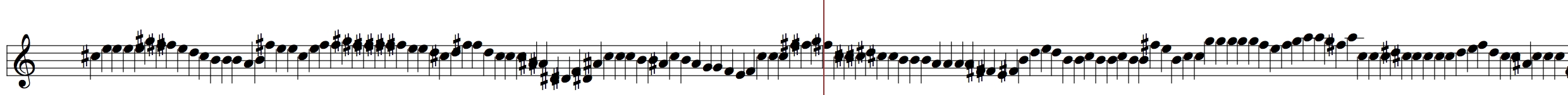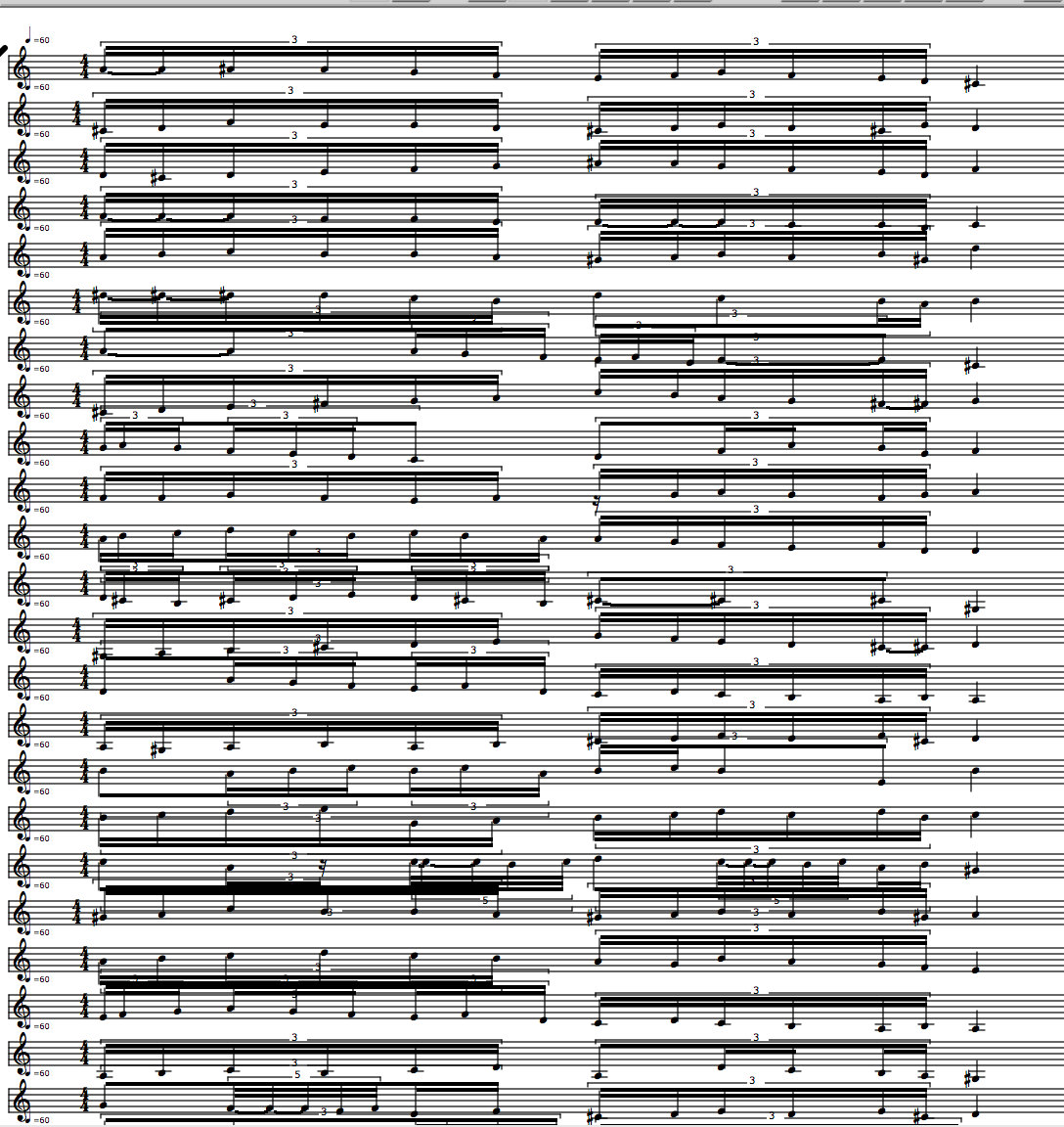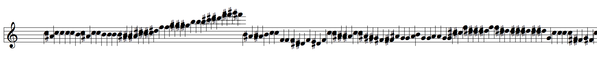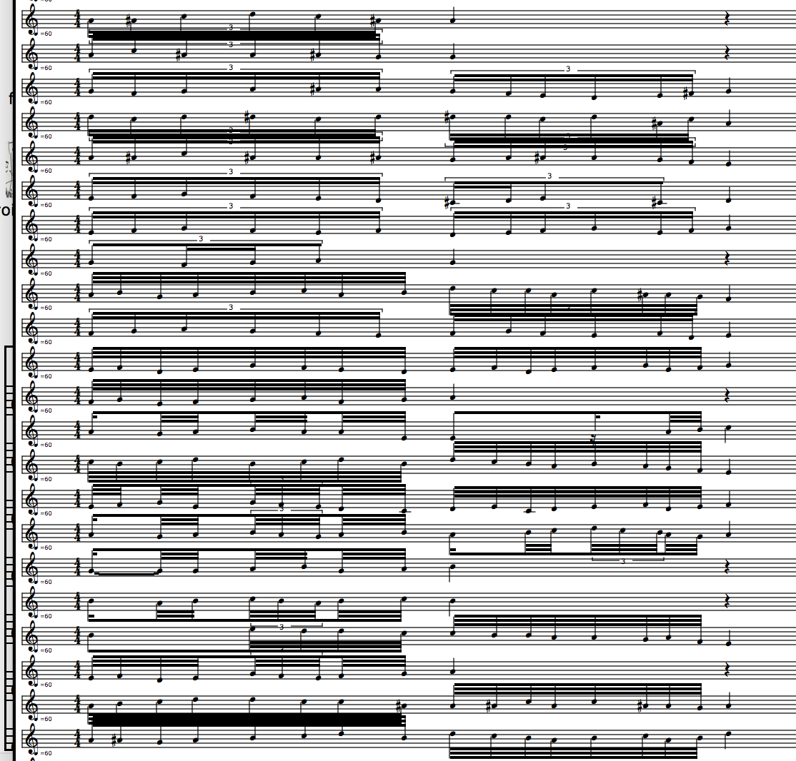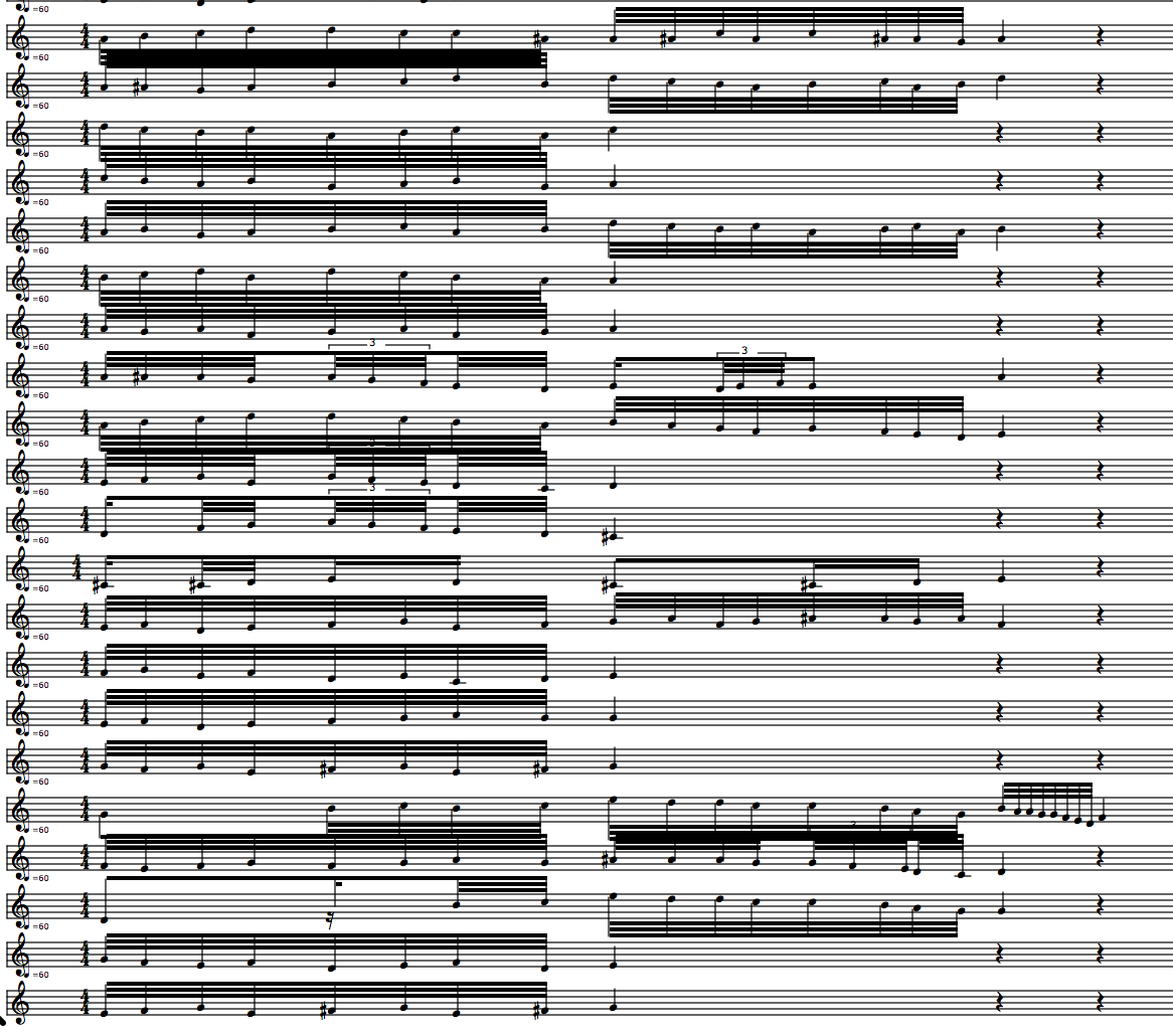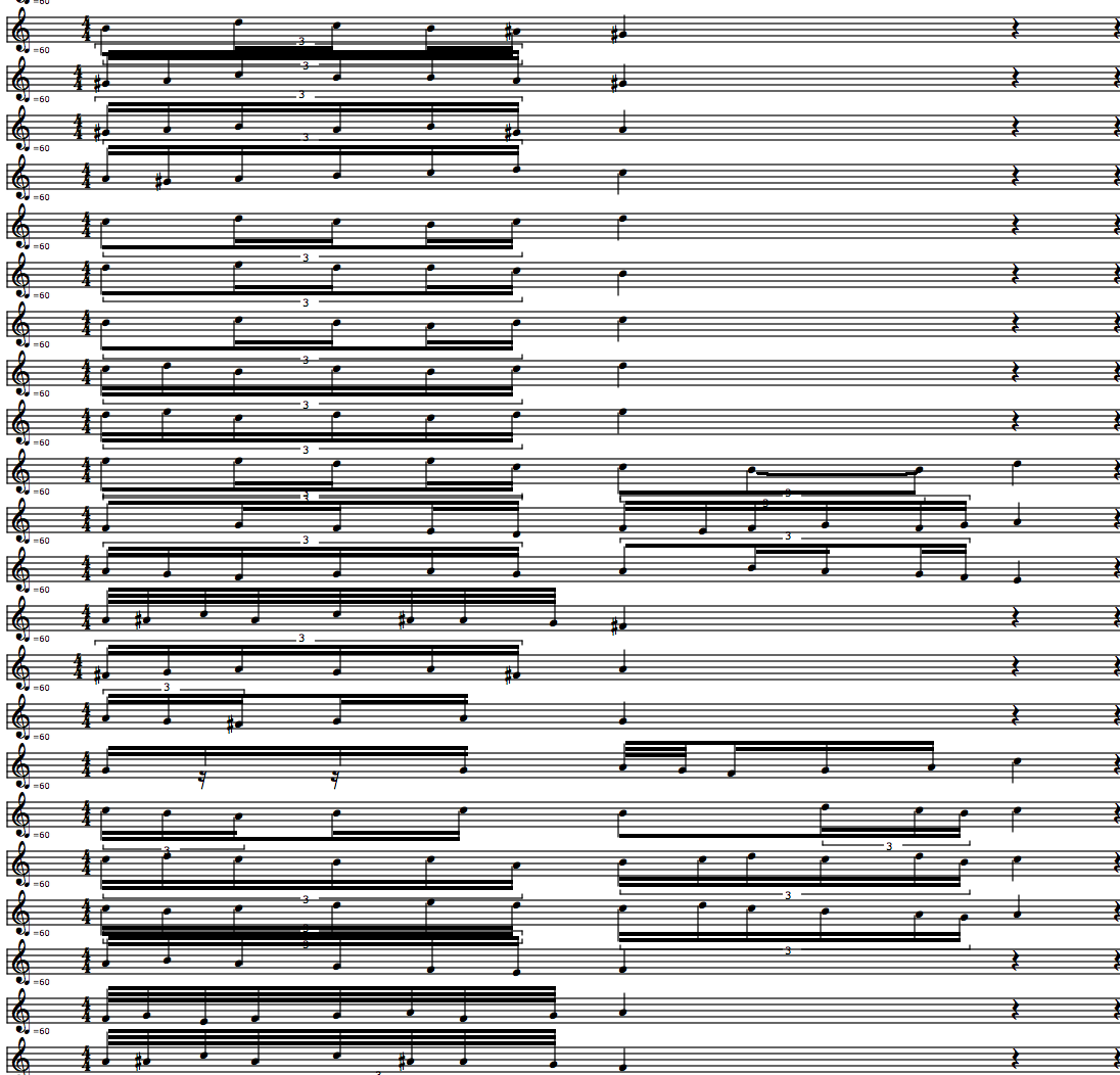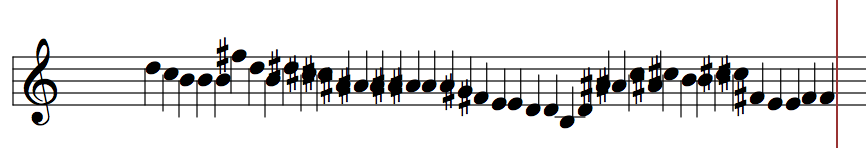 This fractal self-similarity was implemented in the OM-Ruben library through a function called 'r-chord-to-granular-pitch-inflection'. In a demo patch I show an example of using this for granular synthesis with Csound. It was possible to create a dense cloud of notes deduced from randomized melodies or series of figurations from Codex Faenza.