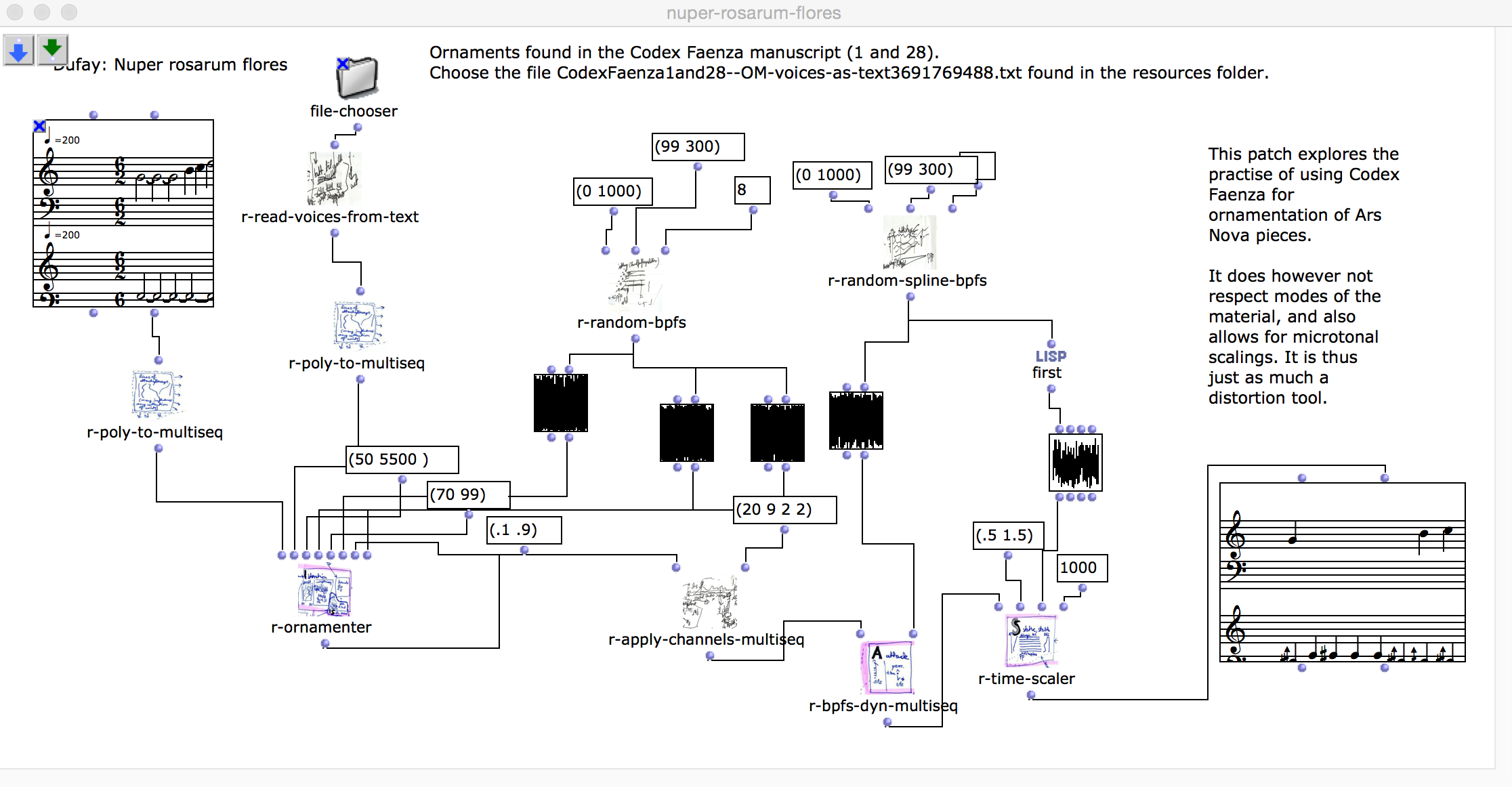 The following demo patch shows Guillaume Dufays motet "Nuper rosarum flores" ornamented by figures from the mentioned parts of Codex Faenza. Each rendering of this patch will create a differently ornamented version of Dufay. It is possible to experiment by replacing the piece and the repertoire of ornaments.