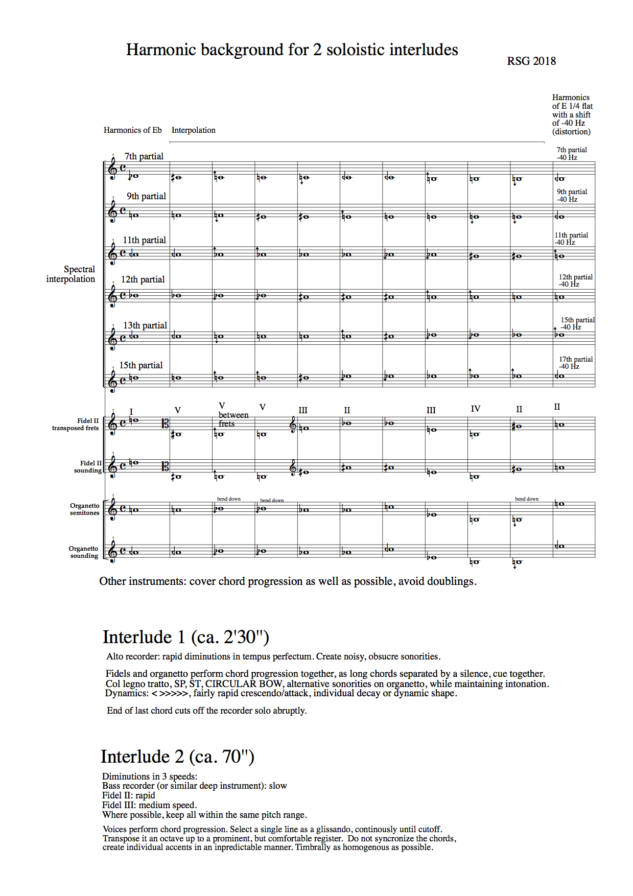 Two types of interludes were performed in the concert. The score contains a plain interpolation between partials of a deep E flat to a transposed, pitchshifted spectrum with another partial order. Early works of Tristan Murail like "Desintegrations" 1 uses such interpolations of overtone series. With a basis in phenomena of timbre or instrumental models, a process of distortion is introduced. This was, if you like, a spectral music etude for a medieval ensemble.