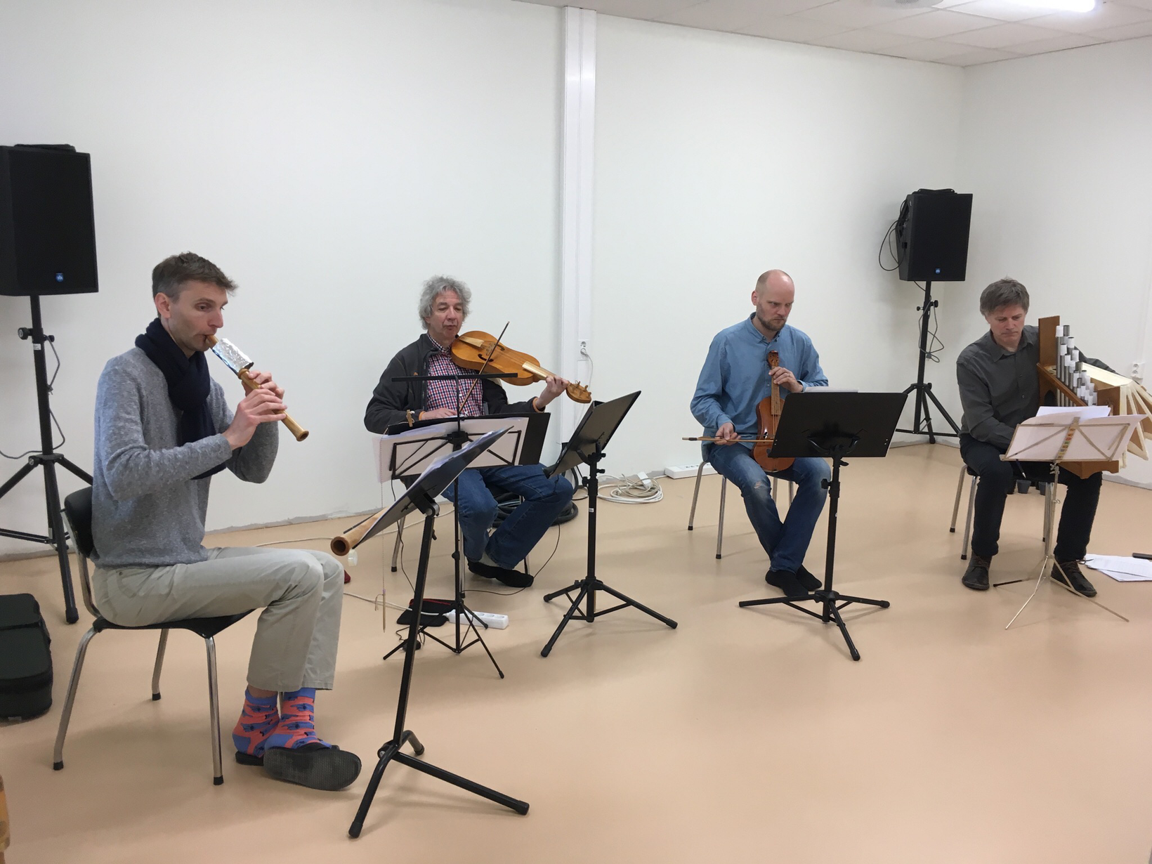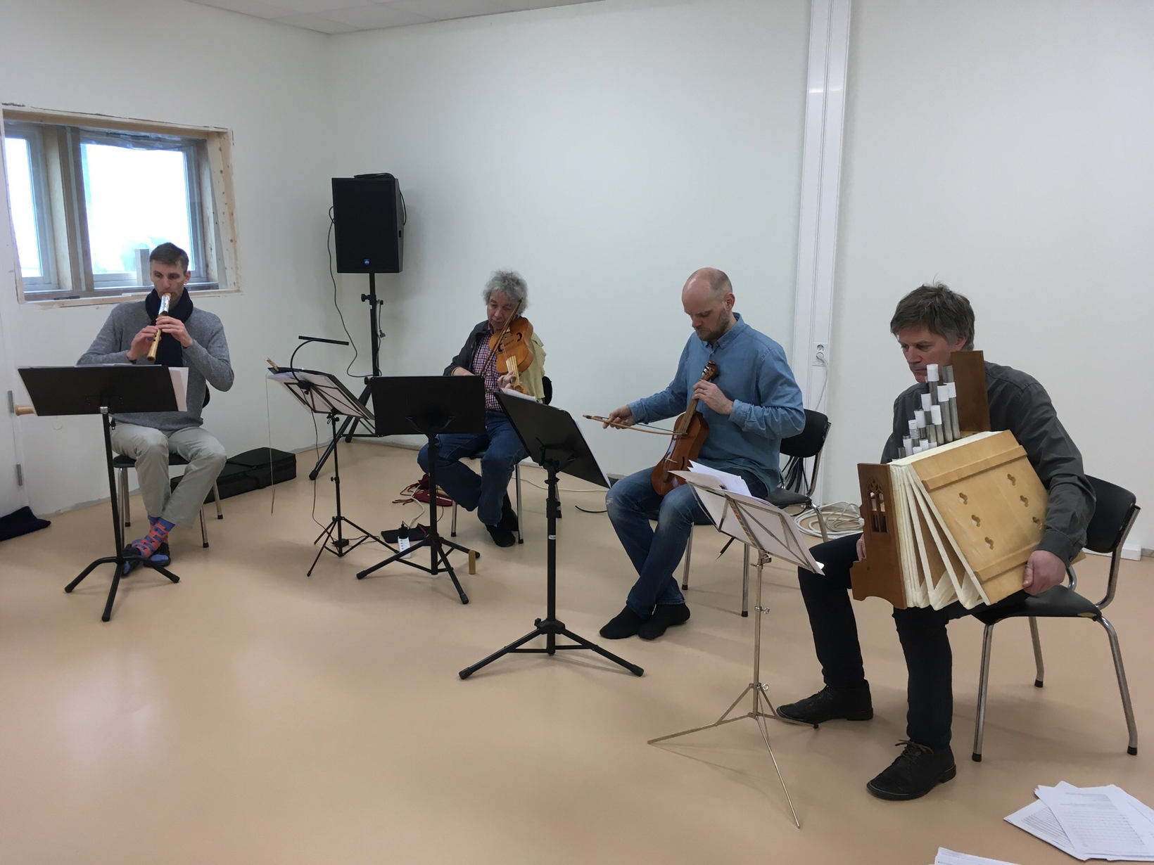 Rehearsal of the Interludes at WRAP. From left to right: Jostein Gundersen on prepared recorder, Hans Lub, Mikko Perkola, Hans Knut Sveen.