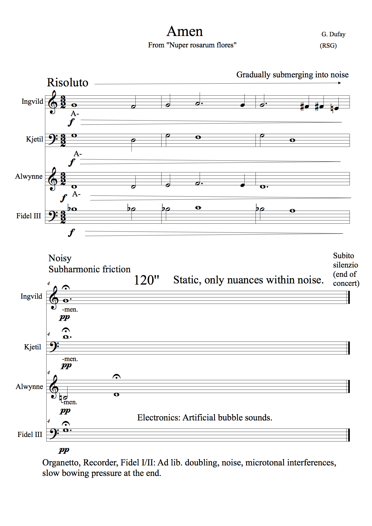 The "Mouvance III: Distortion" concert did, like a mass, end with an amen, from the end of Dufay's "Nuper rosarum flores". The ensemble 'submerged' before the last chord, they ended with a long subharmonic or shimmer while bringing the instrument for a two minute walk amongst the audience.
