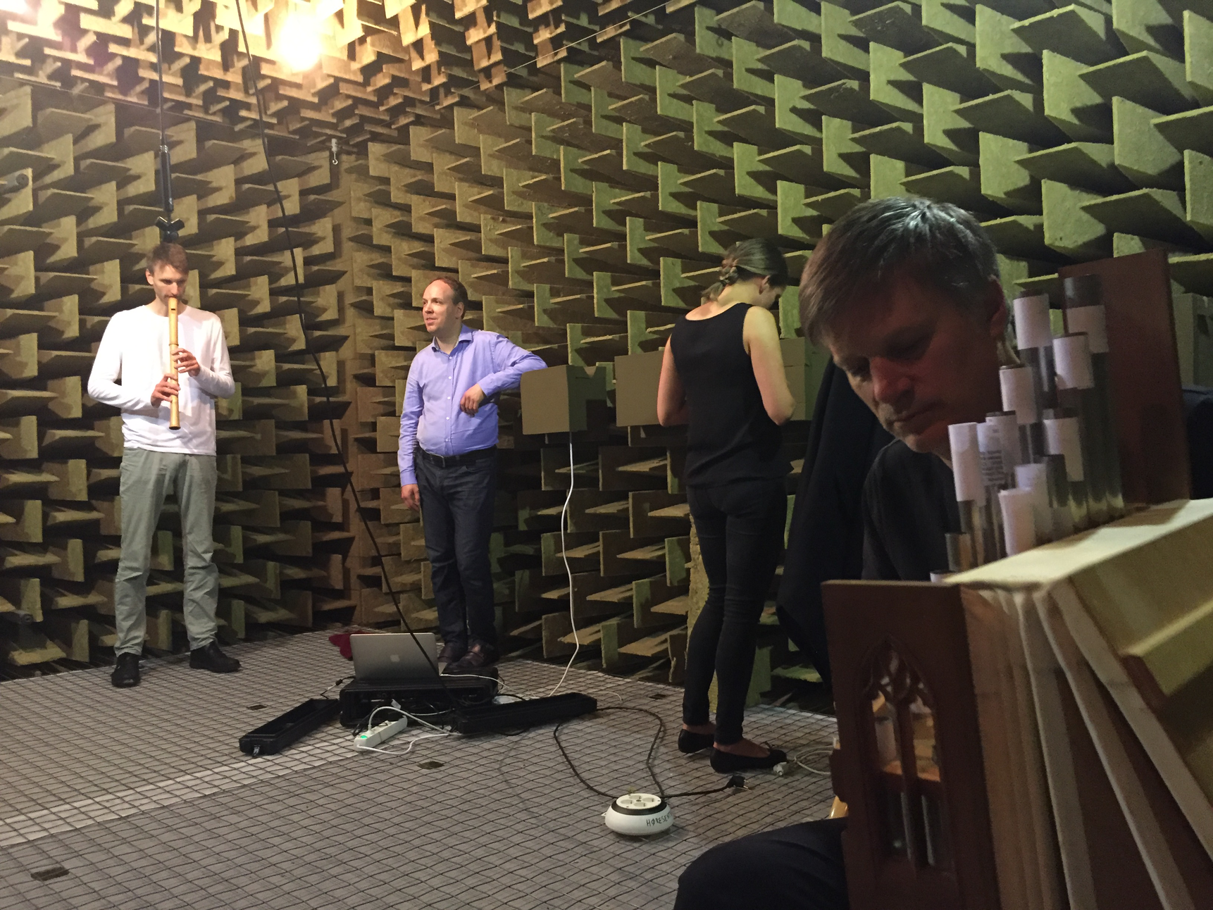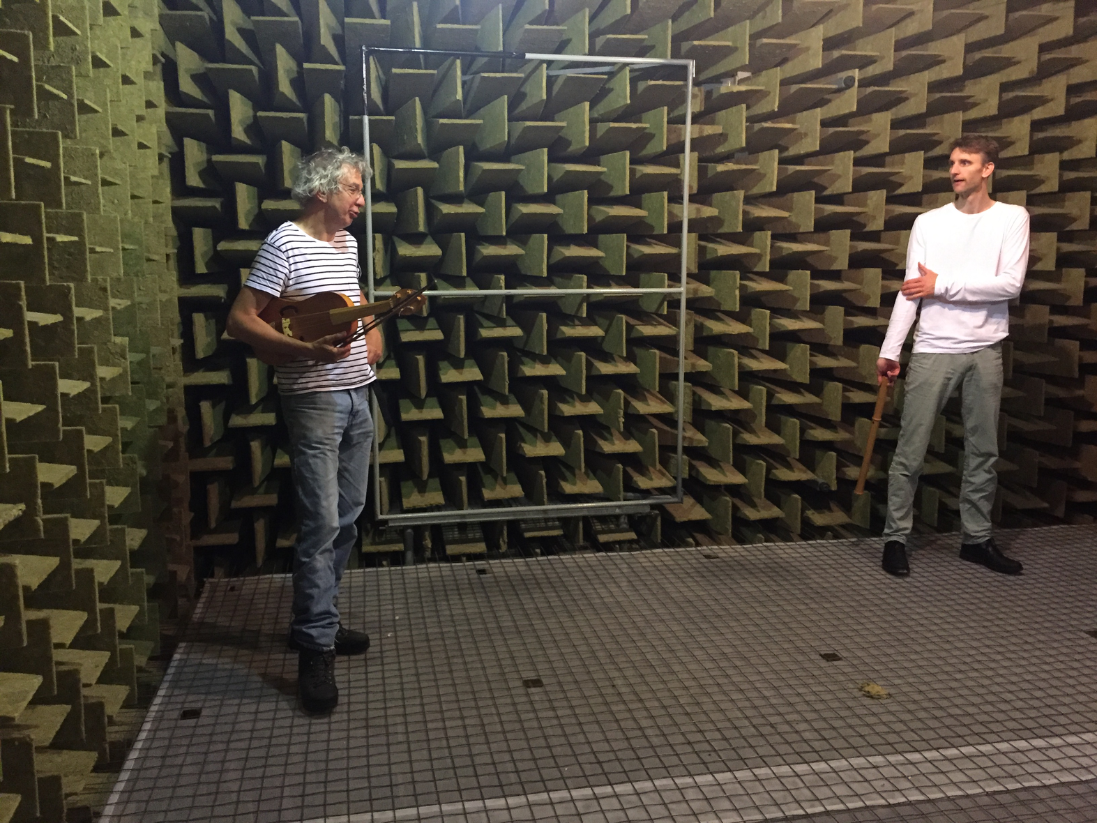 The anechoic chamber added a near claustrophobic experience. The room gives nothing, recordings are very revealing and can capture a large range of details easily blurred in a resonant space. The soundfield microphone was hanging from the roof. This was the best solution, as the floor of steel wires was very audible with the microphone on a stand.