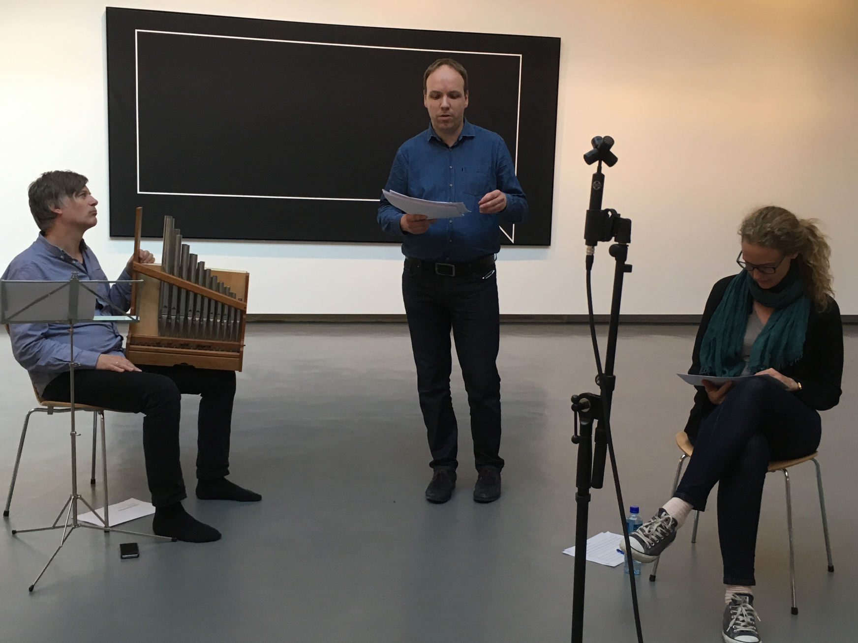 The musicians walked around, exploring the acoustics of different positions, inside and outside the room. The subtle Joyce whispering could balance louder sounds coming from outside in the hallway. Those outside could create a certain energy of being trapped in or expelled to the hallway. There were outbursts of polyphonic singing and shouting I found highly interesting as a composition, standing against the whispering stasis elements.