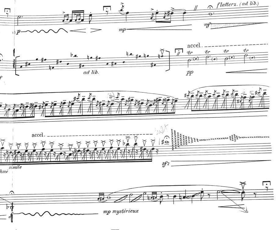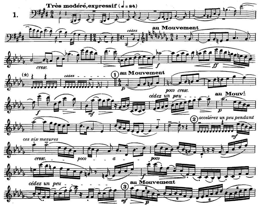 A piece that accompanied me throughout this journey was the Sonate en Ut# (C-sharp) for alto saxophone and piano by Fernande Decruck. This work has always been one of my favorites due to its rich palette of colours and expressive depth. Consisting of four movements, it presents a variety of contrasting characters, yet everything remains interconnected, forming a cohesive musical narrative. Additionally, as a standard in the saxophone repertoire, the piece serves as a reference point, allowing me to showcase the instrument’s expressive possibilities, especially for audiences unfamiliar with its literature. In particular, I found myself returning often to the first movement, as it beautifully showcases a wonderful mix of different timbres and expressive contrasts. It features slow, long legato phrases that highlight the lyrical qualities of the saxophone, while also including more energetic, intense passages that bring out its agility and intensity. This interplay of textures and emotions made it a key element in my exploration of sound and visual interactions throughout this project.