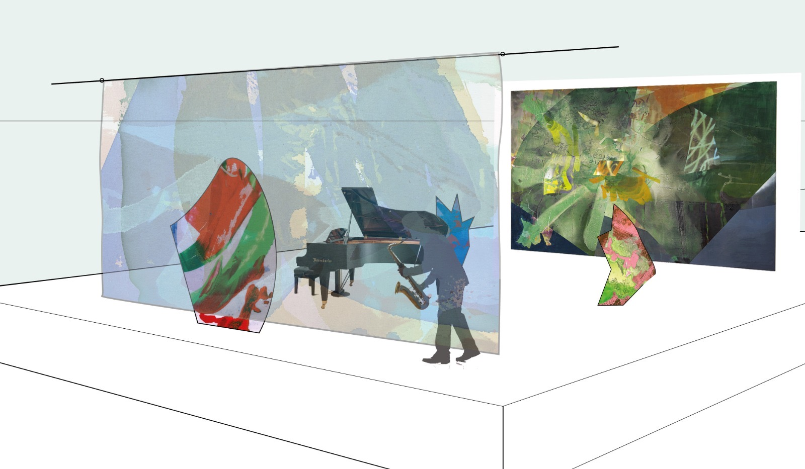 While searching for the material for this special stage curtain, it quickly became clear that this fantastic idea would be challenging to execute in practice. On the one hand, due to the cost of the material (since this specific material would be quite expensive in large quantities) and, on the other hand, due to practical challenges, as it would definitely not be easy to hang this special transparent stage curtain. Additionally, it is simply too inflexible and difficult to apply in most performance venues. So, we abandoned the idea of a transparent stage curtain. However, we concluded that the stage setting would still consist of canvases of various sizes and possibly of different transparencies.