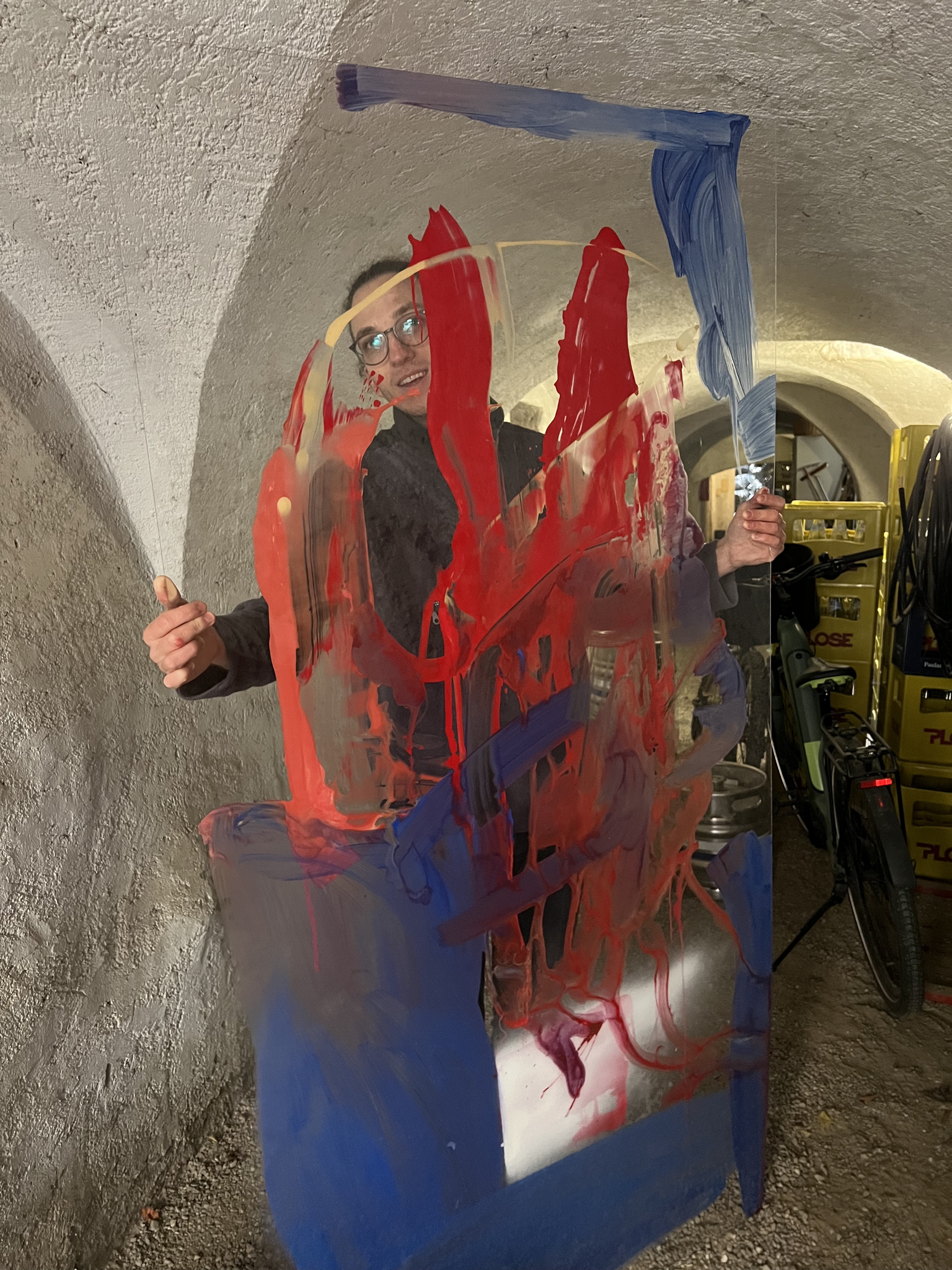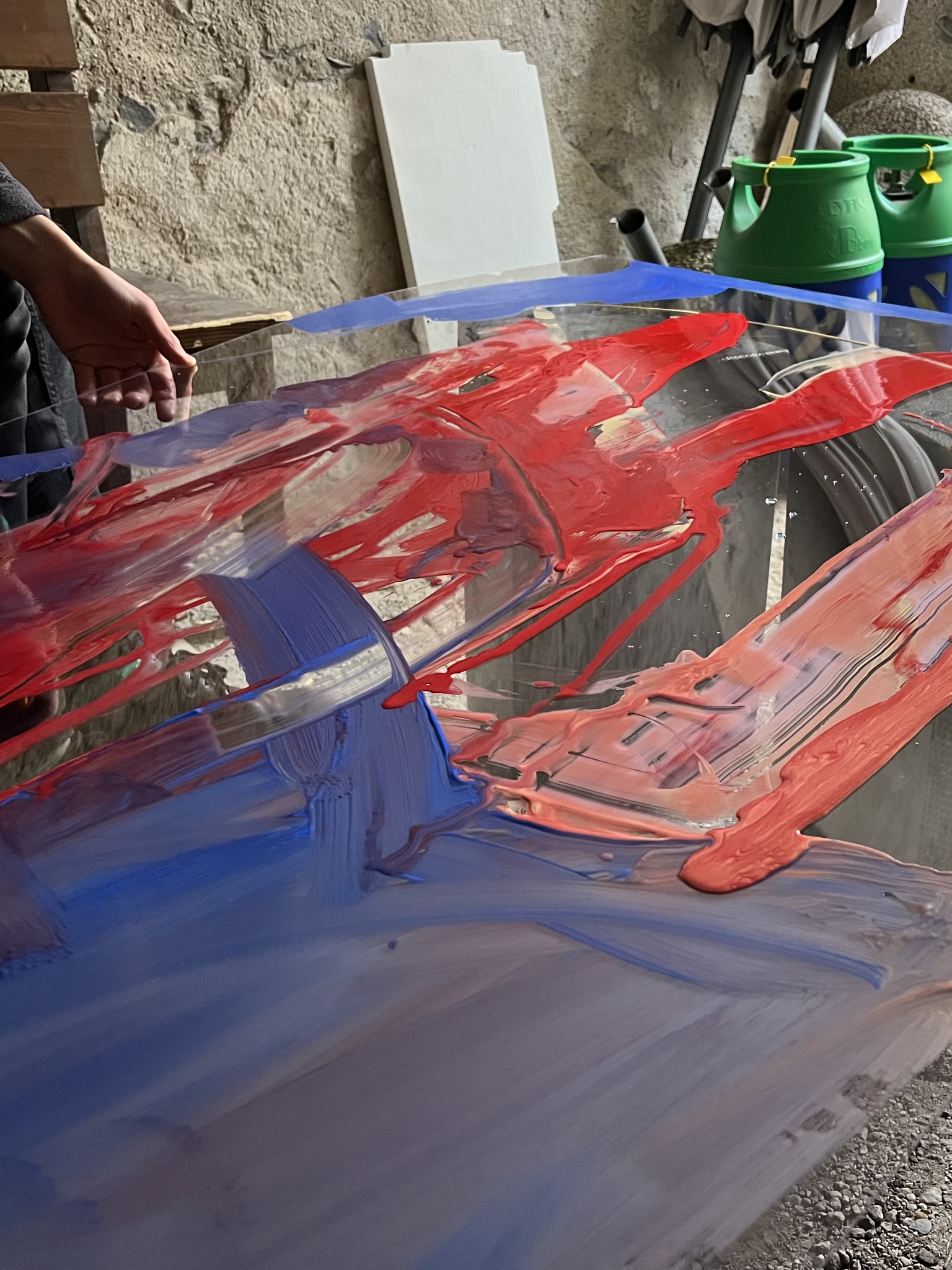 The first element on our to-do list was experimenting with plexiglass as a canvas. The material had already been bought in advance and for the painting Damiano used acrylic paints on this smooth surface. The aim of this experiment was to test the practicality of the idea, particularly considering that during the performance, live painting would take place on the plexiglass canvases. The concept behind this was that I, as the musician, could stand behind such a plexiglass canvas, and as the piece progressed, Damiano could paint on it in a way that the colours would gradually blur me, offering the audience a new perspective on the music.