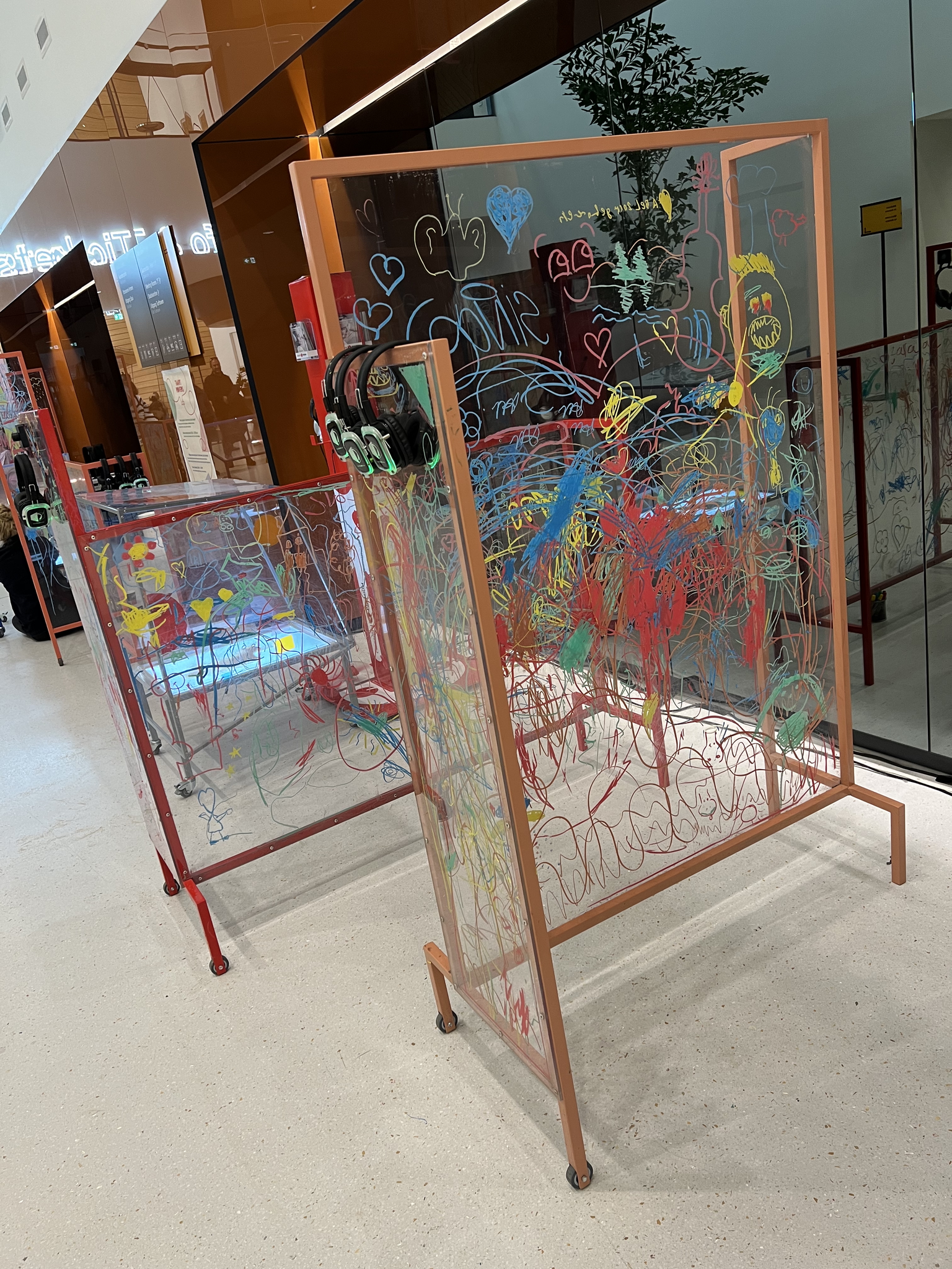 We continued exploring ways to incorporate transparency into the stage setting until, one day, I was inspired by a “frame structure” used at the university itself. The ground floor of the Amare building, which also houses the university, is often used for various events and exhibitions. This time, it was set up as a playground for children, aimed at introducing them to art and music. And that’s when I discovered it: a movable, transparent plastic frame on wheels that children could paint on.
