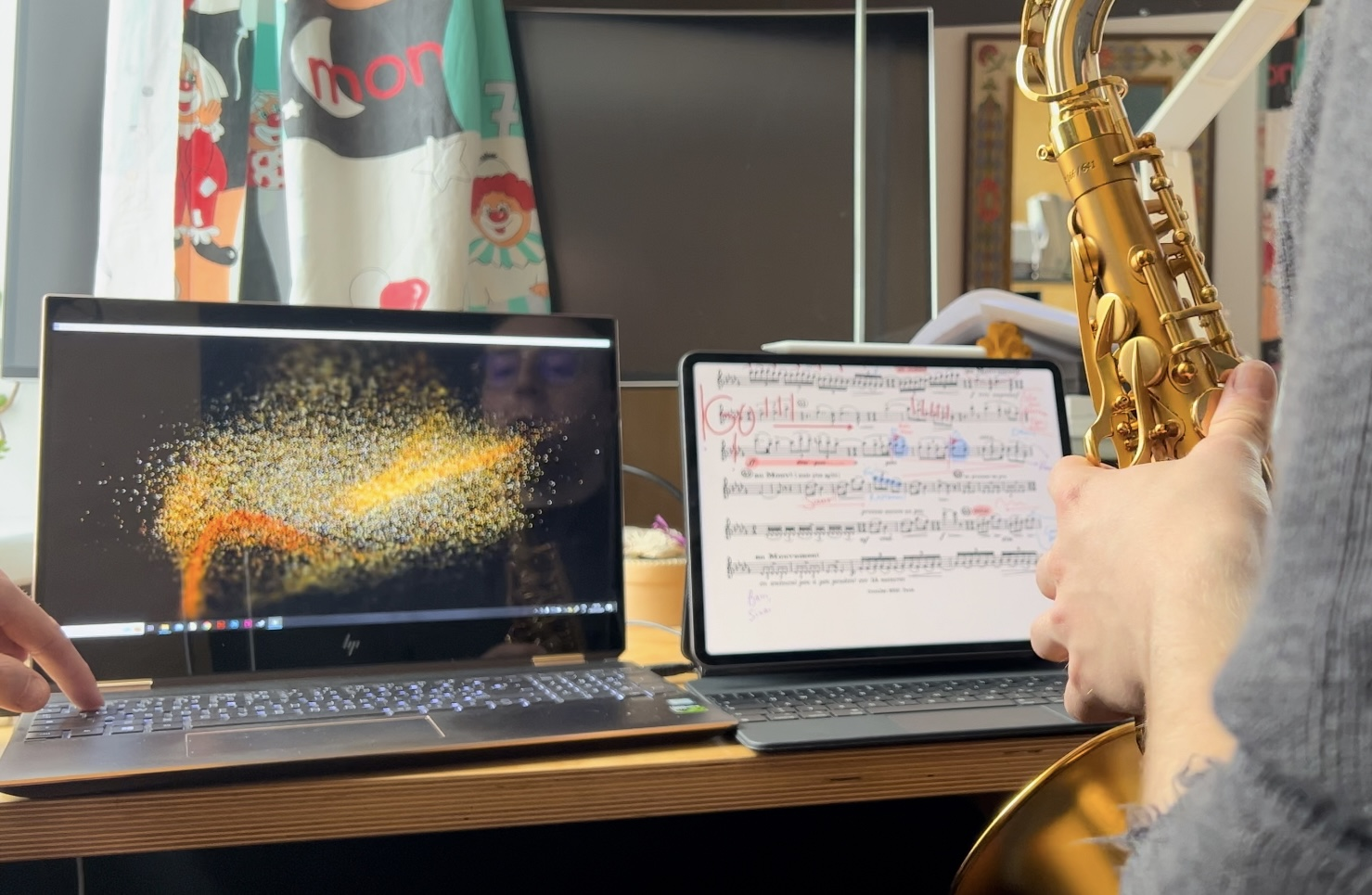 The idea that my instrument could not only create sound but also shape a visual world in real-time was fascinating. As soon as I produced my first note, the digital particles on the screen began to move. The artistic scene prepared by Damiano instantly came to life. It felt as if I was shaping the visuals with my breath! This was an entirely new experience for me: not only was I engaging with my instrument through sound, but I could now rely on both my ears and my eyes, combining auditory and visual perception. The immediate visual feedback made me instinctively adjust my playing, exploring how different articulations, dynamics, and timbres influenced the evolving digital landscape.