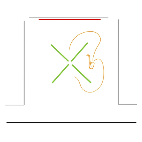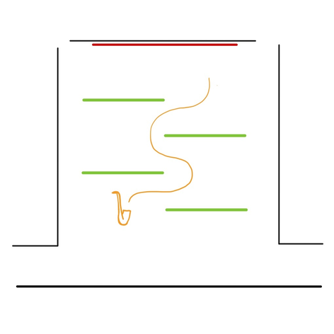 The result of this decision is the following series of sketches, which represent possible stage setups using four canvases. The saxophone and the orange lines are meant to symbolize the musician's movements, as they are meant to merge with the stage design. The musician can either stand next to a canvas or hide behind it, and so on.