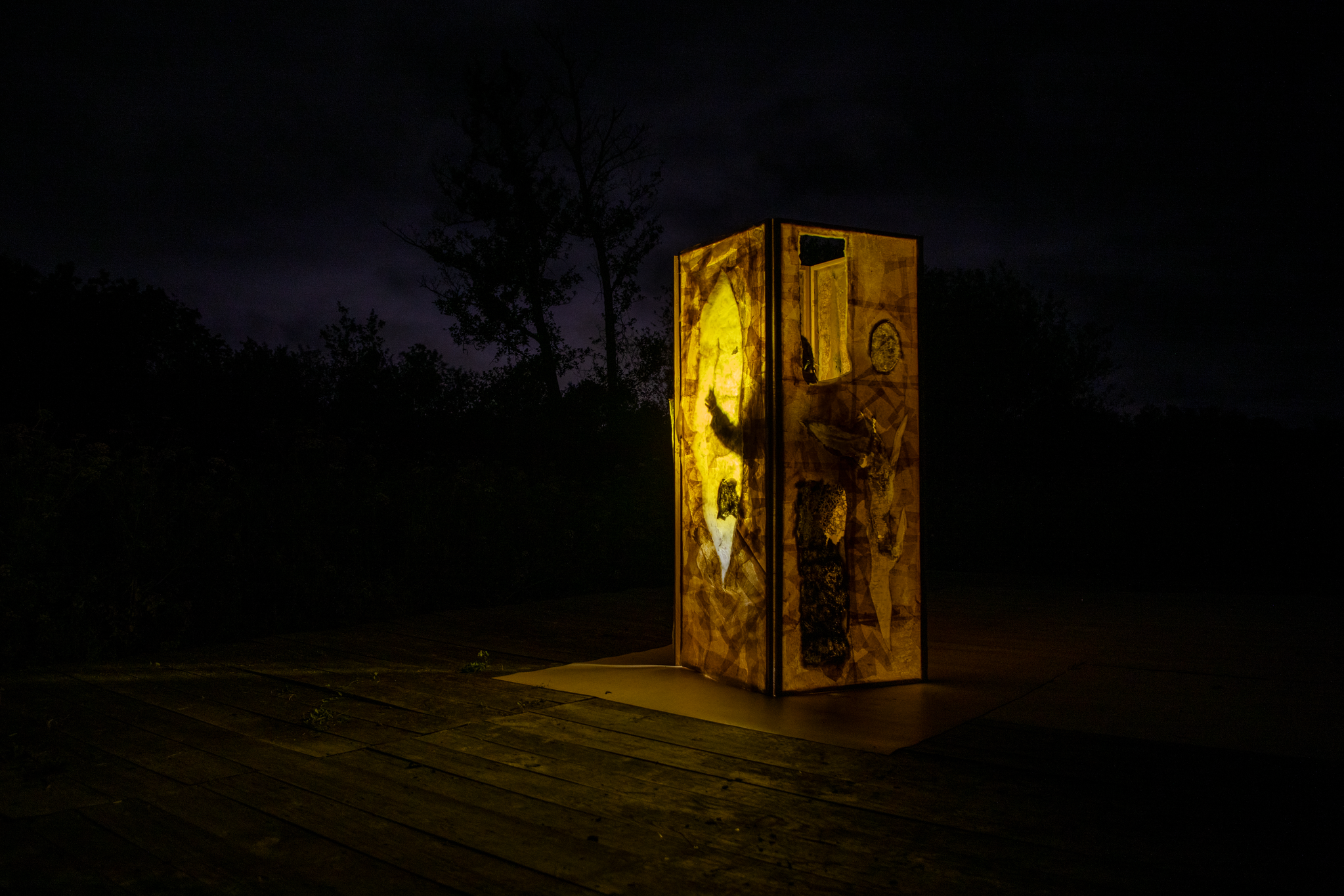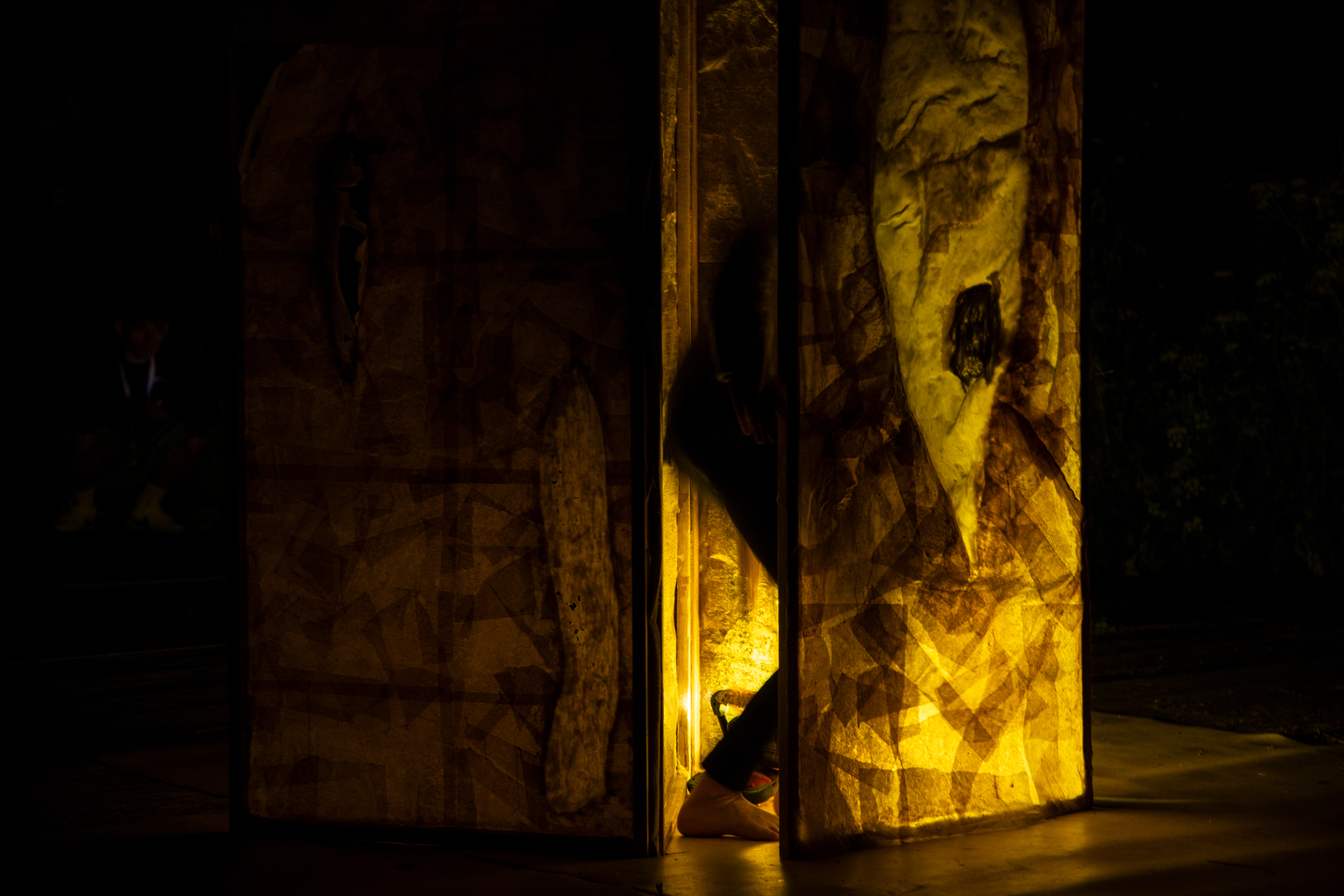 “O corpo aproxima-se de uma barreira semitransparente, onde se revela e se esconde, fragmenta e reconstrói. Uma barreira viva e permeável, que oscila entre proteção e convite, refúgio e passagem, traçando limites fluídos entre o visível e o oculto. A pele torna-se membrana e a membrana, pele. Envolto pela matéria etérea, o corpo desliza em movimentos lentos, tateando e articulando o objeto. Frequências sonoras evocam o ritual onde se encontram os cinco elementos: água, terra, ar, fogo e éter. O “Biombo Sensorial” transforma-se assim num limiar meditativo, num espaço de coexistência, onde o humano e o ambiente se entrelaçam e se reconhecem, evocando a eterna dança de adaptação e transformação, de ver e ser visto.”