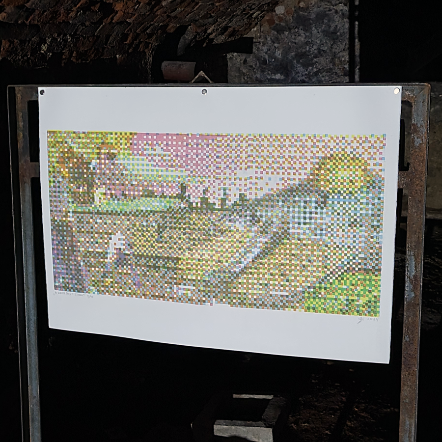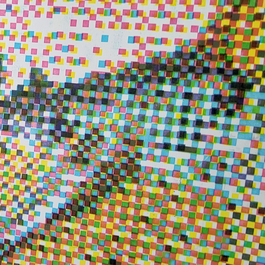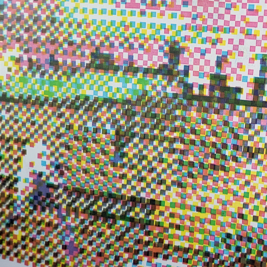 And from a close up view of the print, it changes. No longer distinguishable as a surreal landscape but a mish-mash of now only a four coloured pattern of pixels.