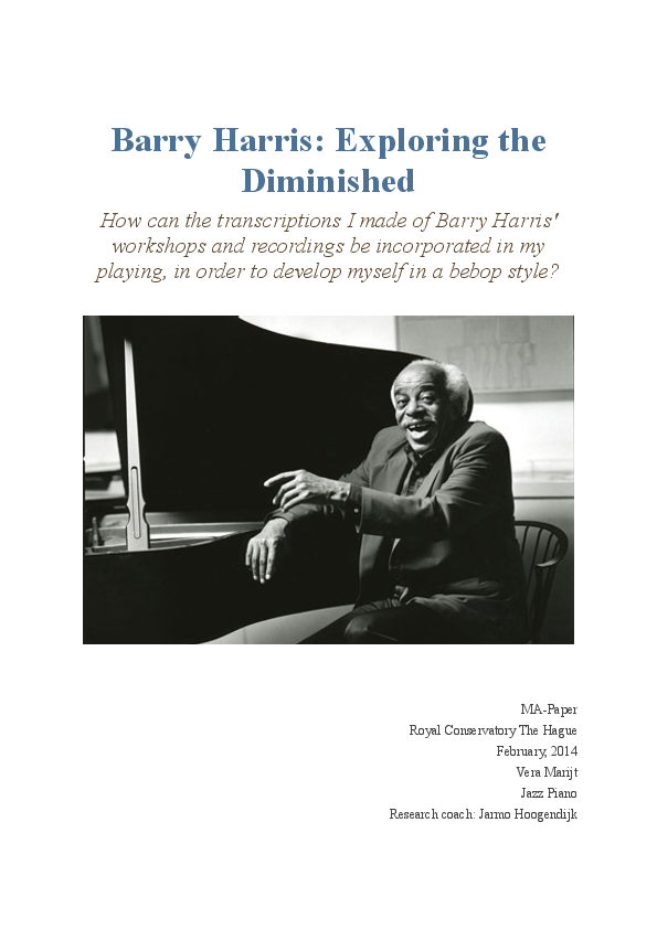 Name: Vera Marijt Main Subject: Jazz Piano Research Coach: Jarmo Hoogendijk Title of Research: Barry Harris: Exploring the Diminished Research Question: How can the transcriptions I made of Barry Harris' workshops and recordings be incorporated in my playing, in order to develop myself in a bebop style? Research Process: I transcribed two DVD boxes containing 8 discs of over 8 hours of workshops by pianist Barry Harris that were recorded and published by Howard Rees. Furthermore, I transcribed about 54 video's of Barry Harris that were published on the website, www.franselsen.com, and several solo's of him. This resulted in about 35 pages of transcribed material, that I sorted and practiced during my Master studies. Summary of Results: Barry Harris talks in his workshops a lot about one important chord; the diminished. He explained how chords are related to the diminished and how we can use the diminished to connect chords and create 'movement'. Two important scales are the major and minor 6 diminished scales. Exercises I got out of the transcriptions and experimenting with this, opened a new world of sounds, voicings, harmonic knowledge and ideas for improvisational lines for me. I apply the material to existing pieces and wrote a composition in which these techniques are used. In the presentation I will explain about the major and minor 6th diminished scales and how they can be applied to tunes.