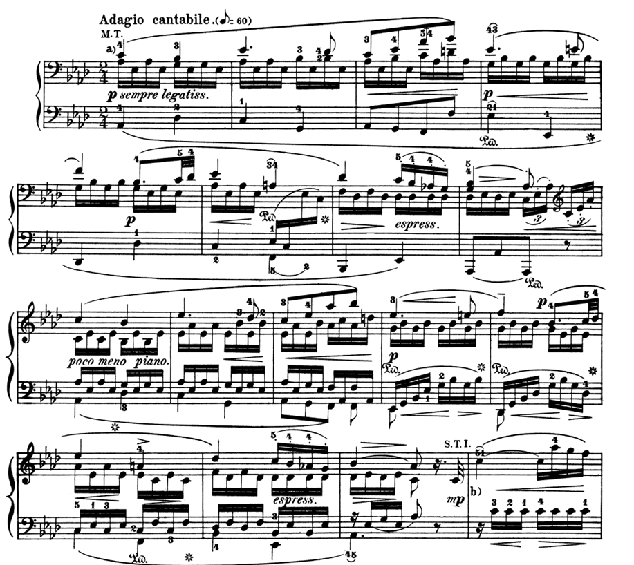 We see from the fingering that the inner accompaniment is to be played by the right hand, without exception. The whole legato, and the melody clearly brought out. The succeeding four-part repetition of the theme, very harmonious, legatissimo, and a little louder.10