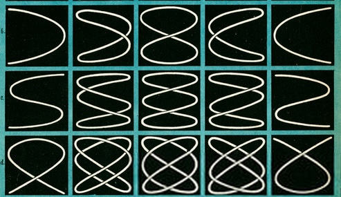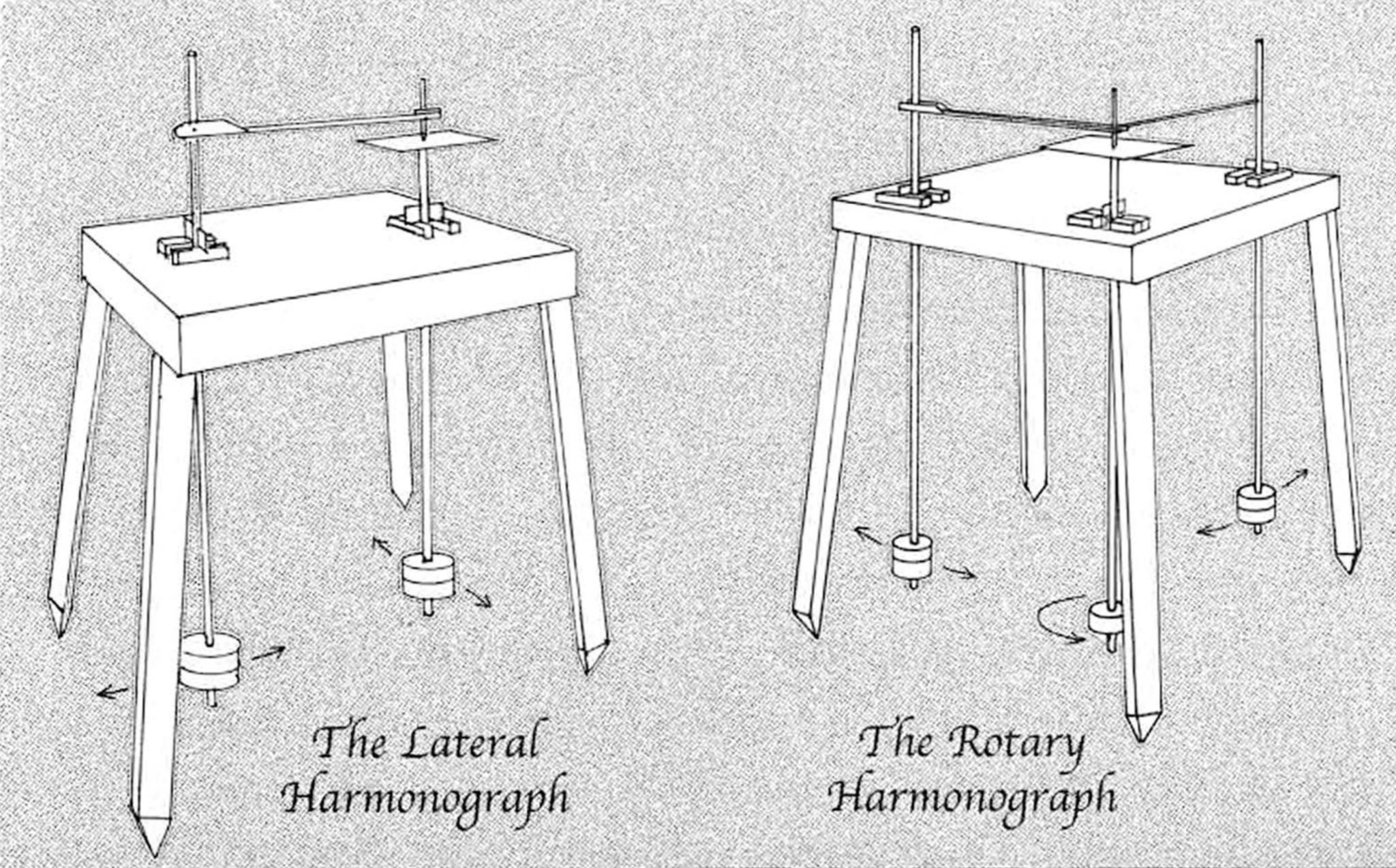 One of the first devices able to visualise Pythagoras' ratios, an ancestor of the oscilloscope, the harmonograph is a mechanical device that creates intricate geometric patterns by translating motion into visual art. It was invented in the mid-19th century by a professor Blackburn. Blackburn designed it to illustrate the principles of harmonic motion using pendulums, captivating both scientists and artists with its ability to generate mesmerising designs. Anthony Ashton in his book about the harmonograph states that “the instrument draws pictures of musical harmonies, linking sight and sound.”1 In a lateral harmonograph, two pendulums swing in perpendicular directions—one controlling horizontal motion and the other vertical. Their combined oscillations create patterns influenced by frequency, amplitude, and phase, ranging from simple ellipses to intricate spirals. A rotary harmonograph introduces rotational motion, often using a spinning platform or pendulums with rotational attachments. These mechanisms create more symmetrical and complex designs, resembling floral or mandala-like patterns. The harmonograph gained popularity during the Victorian era, blending scientific exploration with artistic expression. Exactly like the oscilloscope, it beautifully demonstrates the interplay of physics and mathematics, particularly harmonic motion and resonance. I will take a closer look on how to recreate the lateral and rotary technique on the oscilloscope in the practical part of this research (see paragraphs 10.1 and 11). It is relevant to mention here the Kaleidophone and the Chladni patterns (or Cymatics) for the reader further curiosity.