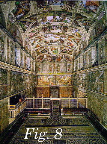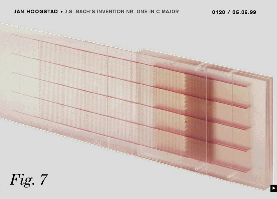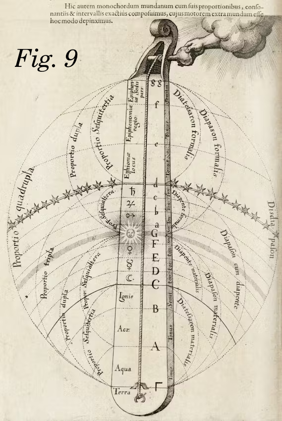 Building on Pythagoras’ ideas, Aristotle theorized a connection between color harmonies and musical proportions, which I will discuss in the chapter on colors in visual music. Similarly, Roman architect Vitruvius emphasized the need for architects to understand music to comprehendcanonical and mathematical relations. Leon Battista Alberti, the Renaissance polymath, famously wrote: The same numbers, by means of which the agreement of sounds affects our ears with delight, are the very same which please our eyes and mind. We shall therefore borrow all our rules for the finishing of our proportions from the musicians, who are the greatest masters of this sort of numbers5. A fascinating modern example of this connection is Jan Hoogstad’s work inspired by Bach’s music (figure 7). The visual arts also reflect this relationship. Italian painter Arcimboldo’s (1527–1593) works have been interpreted as inspired by Pythagorean harmony6. Michelangelo’s Sistine Chapel frescoes incorporate a 5:4 ratio, corresponding to the Miserere Mei by Gregorio Allegri, a piece composed for exclusive use in the chapel7 (figure 8). In the concept of the "harmony of the spheres," this correspondence is extended to the cosmos, as seen in the works of Robert Fludd8 (figure 9), Athanasius Kircher9, or Johannes Kepler10 (figure 9b).