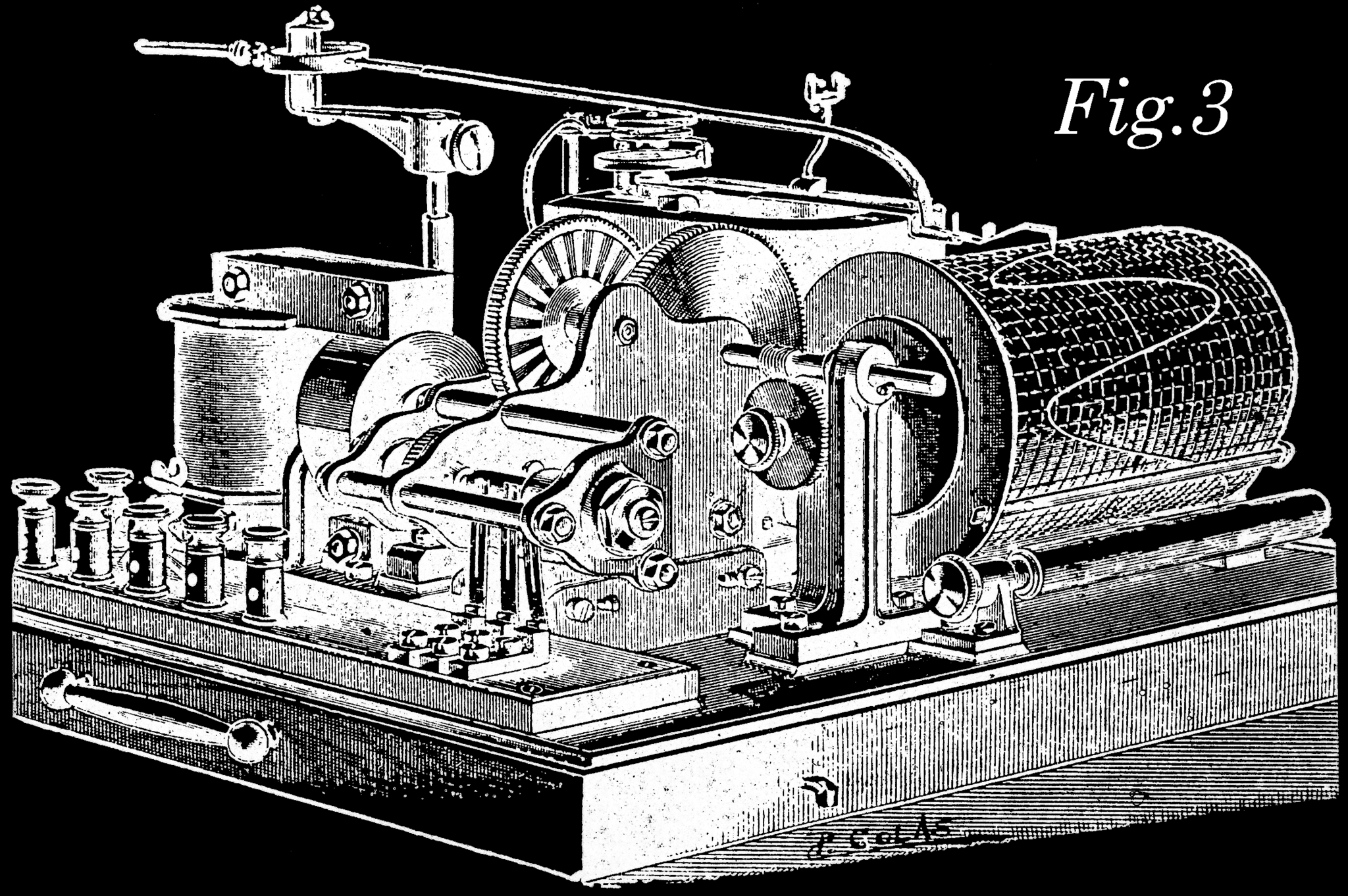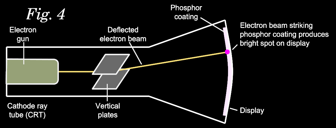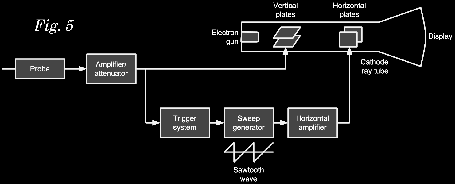 We have already introduced the oscilloscope, but to refresh our understanding, it is a device that displays how the voltage between two points in a circuit varies over time. For instance, when connected to a sinusoidal voltage source, the oscilloscope displays a wave-like pattern (fig. 1, 2). One of the earliest attempts to automate the conversion of electrical signals into a visual display was the Hospitalier Ondograph, developed in the early 1900s (fig. 3). This device used a capacitor to drive a galvanometer with a pen attached. As voltage varied, the pen traced a waveform on scrolling paper. However, the Ondograph's mechanical system was too slow to keep up with rapidly changing electrical signals, requiring multiple samples to accurately record them. In the late 19th century, scientists studying cathode rays (electrons traveling in straight lines in a Crookes tube) discovered that these rays could be deflected by electric or magnetic fields. In 1897, German physicist Karl Ferdinand Braun built the first oscilloscope using a cathode ray tube (CRT). By applying voltage to vertical plates, he directed an electron beam to strike a phosphor-coated screen, producing a visible dot that moved vertically with voltage changes (fig. 4). In 1899, physicist Jonathan Zenneck added horizontal plates, enabling the beam to sweep side-to-side. This innovation allowed the oscilloscope to display real-time graphs of electrical signals (fig. 5).