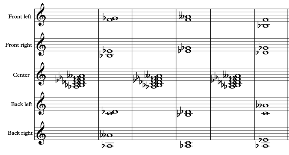 Each of the two chord sequencers was sent to one half of the octaphonic speakers, dividing the space into two sections (Fig. 15):