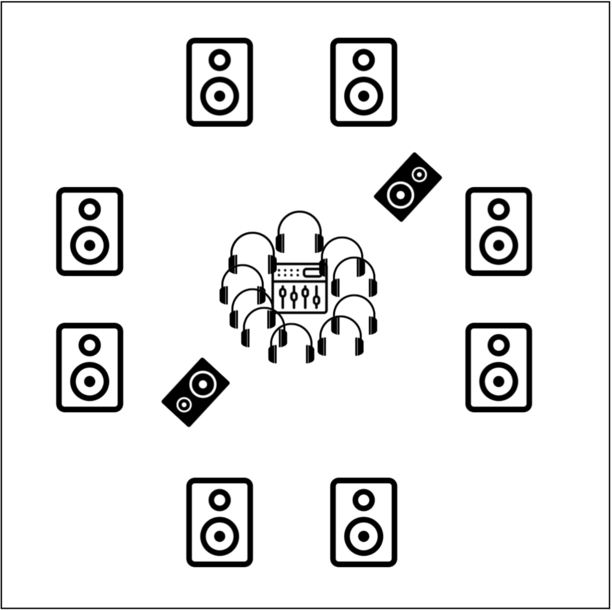 Regardless of the level of isolation, headphones deliver the singular experience of having sounds attached to one’s ears. When incorporated with movement, this brings the listener the possibility of trying out different head orientations, locations, and paths for exploring musical combinations between the headphones and the speakers. Moreover, this allows each listener to have a fully individual experience of the music, as no two people can occupy the same place at the same time. From a creative perspective, this invites the composer to be economical in the generation of material, as this material will be moulded by the audience in the space.