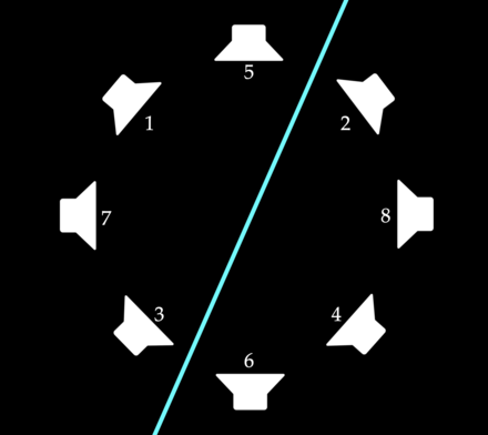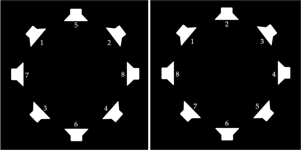 For practical and compositional reasons, the numbering for the speakers in 10 Neon is continuous clockwise, rather than the conventional octaphonic numbering system (Figure 13).