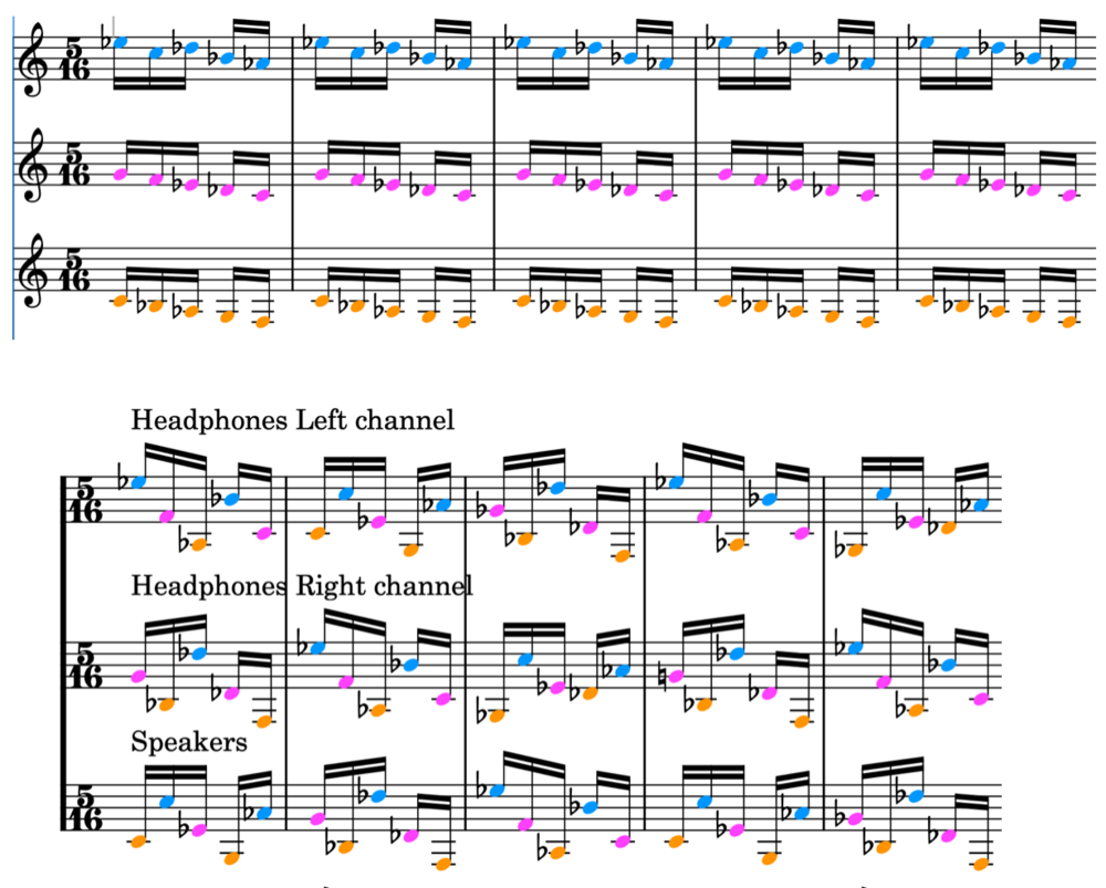 The section is built with three arpeggiator layers distributed in the speakers, and dichotically in the left and right channel of the headphones. In the same way as in the melodic channeling experiment by David Butler, three continuous patterns are interspersed between the three sources, resulting in three disjunct patterns (Fig. 16).