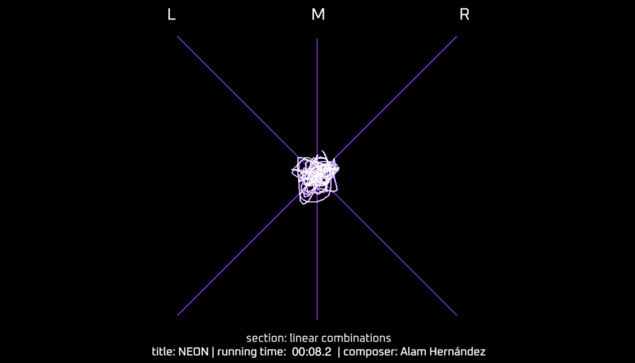 Regarding form, 10. Neon is a 26 minute-long seamless loop without delimitate start or end points; in this way, the audience can come in and out of the installation at will and start listening to the piece at any given moment. In the same lines of relativity, the audience is encouraged to move around the space for exploring different acoustic perspectives; there is no sweet spot for this piece and any position is equally valid.