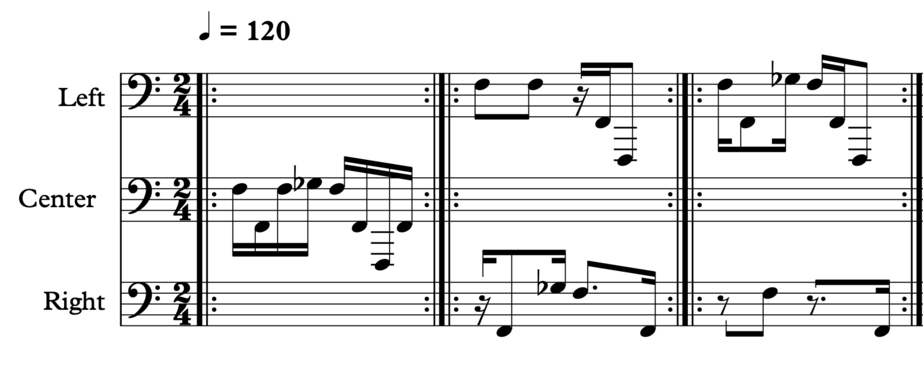 The theremin in the headphones, serve as a connecting line during this section, having solely this musical purpose. The intermittent drums, on the other hand, are intended to serve as a navigation guide for the listener’s attention inside the polyrhythmic texture. The drums in the headphones are hard-panned, traveling between the left and right channels. The movement of the drums in space easily drag the ear of the listener and move their attention from one side to the other, shifting their focus between the rhythmic layers of the chord sequencers in the speakers.
