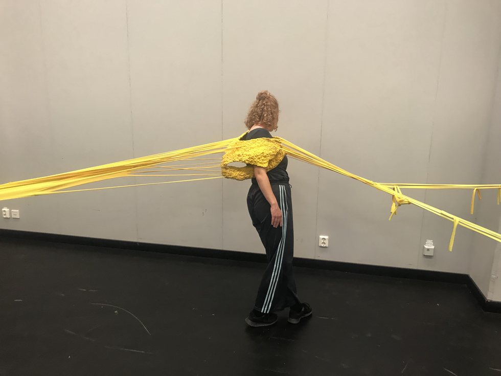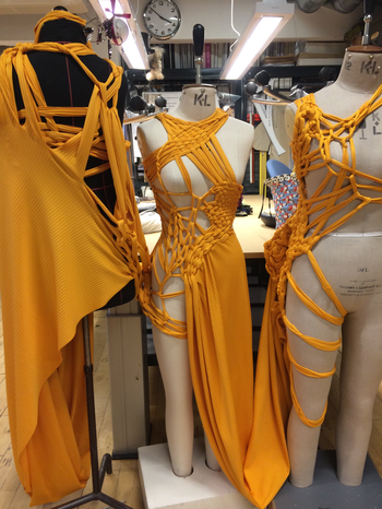 (1) For this KUV (kunstnerisk udviklings virksomhed translates to artistic research) project, Textile Techniques as Potential for Developing Costume Design, (2016/2017) I invited three tailor colleagues (employed) at the Danish National School of Performing Arts to join me. Side by side and in dialogue we (individually) developed several costumes using crafting techniques inspired by braiding. One of my research ambitions was to invite the tailors to make costumes from a perspective different to that of their daily work at the school. As they usually produce costume in collaboration with and from drawings made by scenography students, they never develop their own costume ideas. As I was challenging the tailors, I also wanted to challenge myself. Therefore, I intentionally chose a role of stretchable material that the tailor workshop had stored for years which I did not find particularly inspiring. The textile smelled and its yellow colour was a bit too murky to my taste.