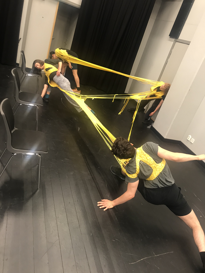 In The scenographic, costumed chorus, agency and the performance of matter: A new materialist approach to costume Donatella Barbieri (1) and Greer Crawly (2) write that the performativity of costume is generated through material discursive processes (Barbieri & Crawley 2019, 143). In our case I suggest that the performativity of the AweAre costume was evoked by the stretchability of and the ‘push and pull’ between the different spatial positions. Moreover, during the process I followed the dancers and we bounced between exploring, listening, sharing and reflecting/discussing, whereby we co-creatively became aware of aspects of the performative potentials of the AweAre costume. I write aspects in the acknowledgment that our process was rather short.