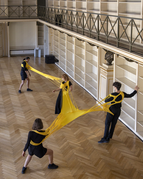 The next day (25 June 2020) we meet at the performance location Det Classenske Bibliotek (Copenhagen, Denmark) where we have one hour to rehearse in the space. We discuss whether the performers shall enter and exit from the same door or from two opposite doors – we decide on the former. The dancers explore the simple dramaturgical score: entering the space, moving to the end of the space, turning and returning to exit from where they entered the space. Before we know it, the hour is over.