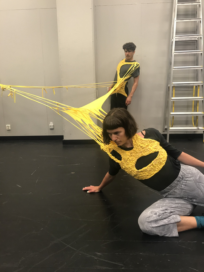 We continue, somehow more focused now that the placements are divided. The atmosphere is playful, and the dancers explore the movement possibilities in their wearable parts and explore how their placements impact the group.