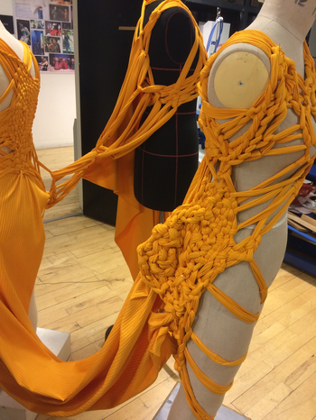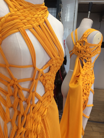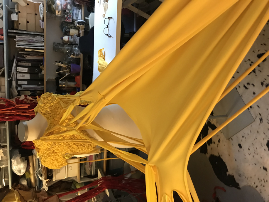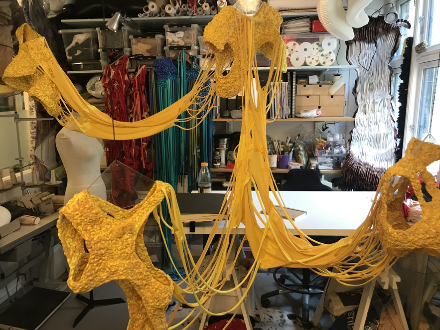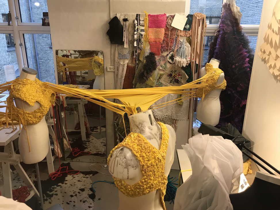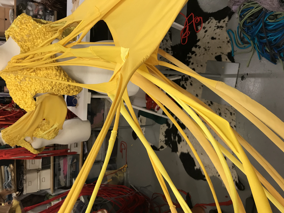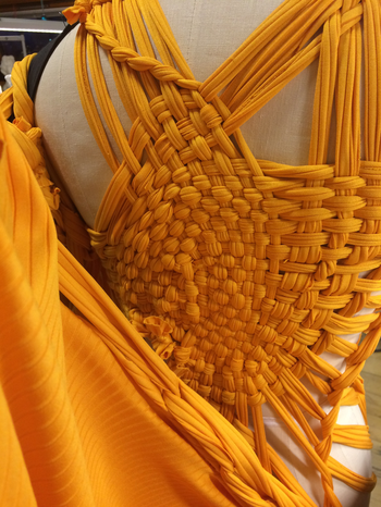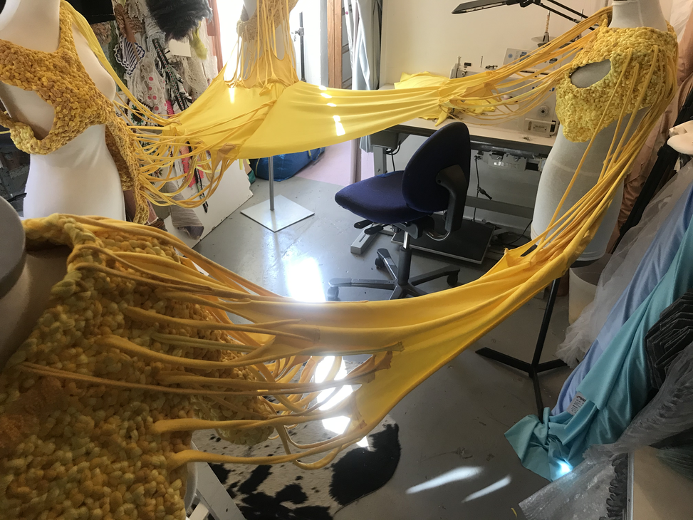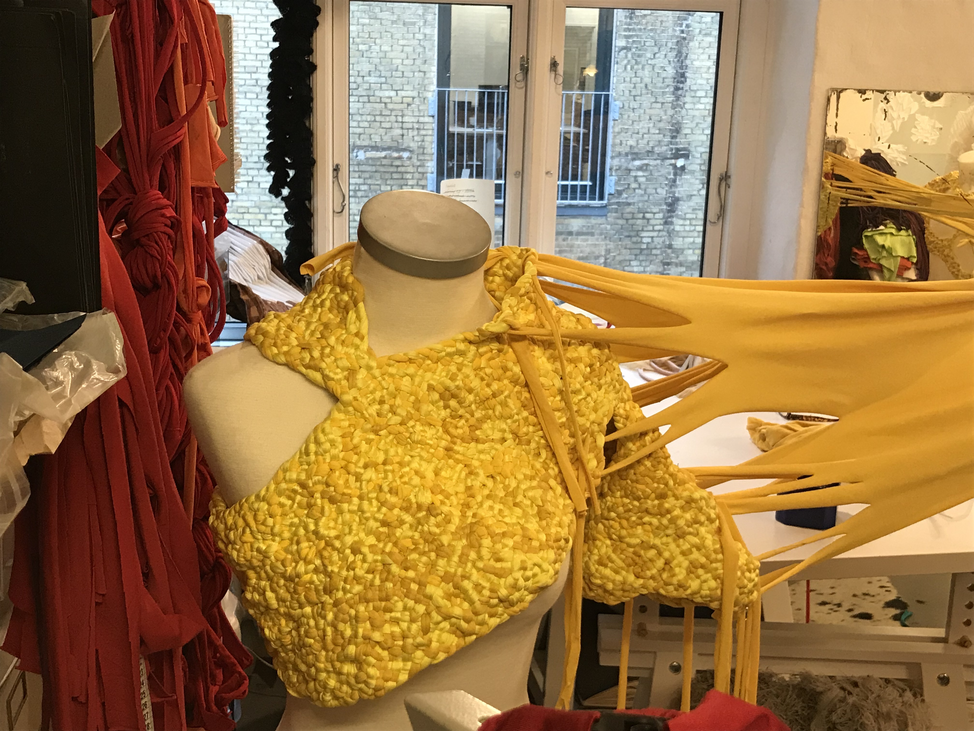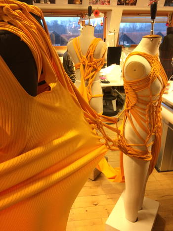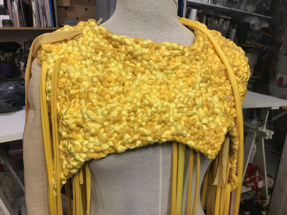 (1) For this KUV (kunstnerisk udviklings virksomhed translates to artistic research) project, Textile Techniques as Potential for Developing Costume Design, (2016/2017) I invited three tailor colleagues (employed) at the Danish National School of Performing Arts to join me. Side by side and in dialogue we (individually) developed several costumes using crafting techniques inspired by braiding. One of my research ambitions was to invite the tailors to make costumes from a perspective different to that of their daily work at the school. As they usually produce costume in collaboration with and from drawings made by scenography students, they never develop their own costume ideas. As I was challenging the tailors, I also wanted to challenge myself. Therefore, I intentionally chose a role of stretchable material that the tailor workshop had stored for years which I did not find particularly inspiring. The textile smelled and its yellow colour was a bit too murky to my taste.