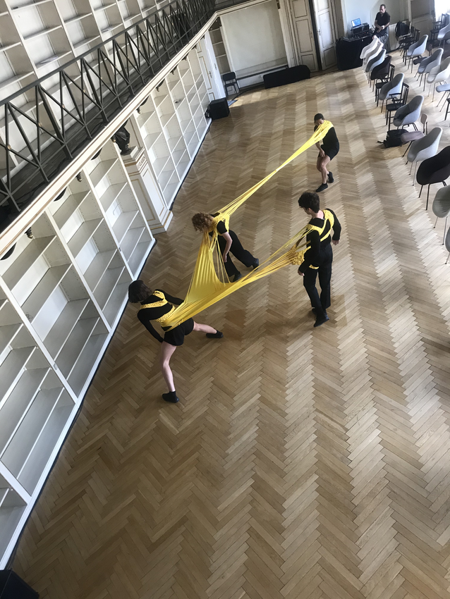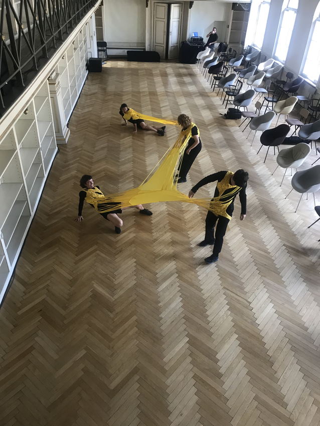 Here we are on the first day (23 June 2020), in a black box studio space at Malmö Theatre Academy, Sweden; four dancers, the bright yellow AweAre costume and me.