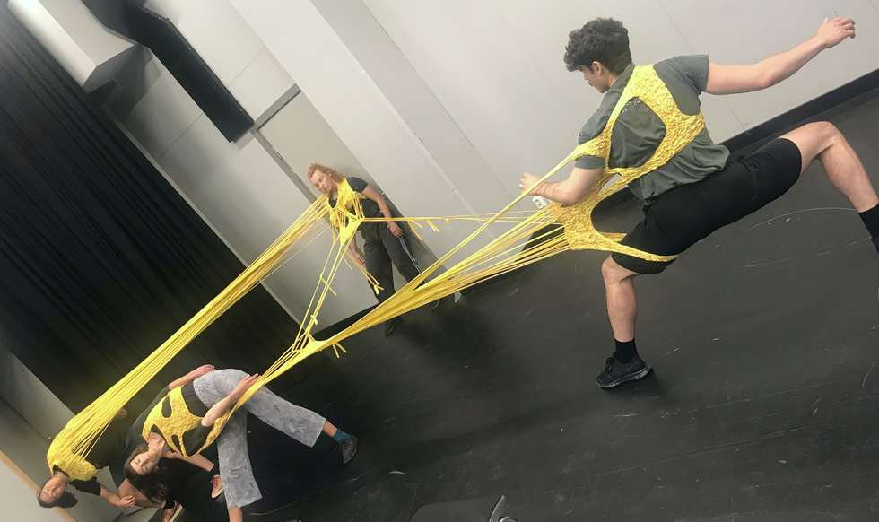 We continue, somehow more focused now that the placements are divided. The atmosphere is playful, and the dancers explore the movement possibilities in their wearable parts and explore how their placements impact the group.