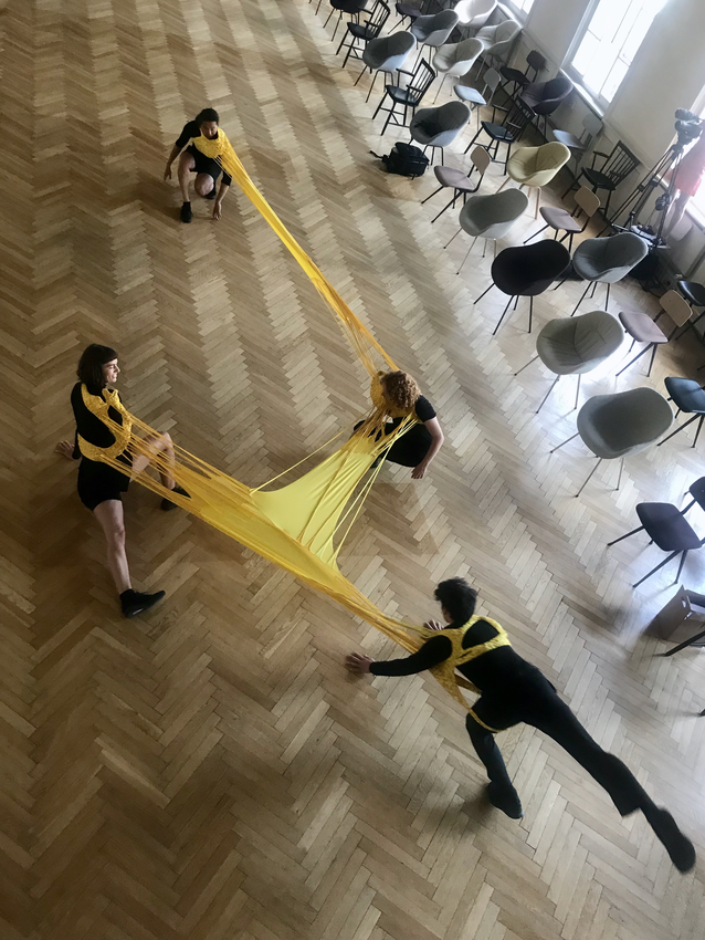 In The scenographic, costumed chorus, agency and the performance of matter: A new materialist approach to costume Donatella Barbieri (1) and Greer Crawly (2) write that the performativity of costume is generated through material discursive processes (Barbieri & Crawley 2019, 143). In our case I suggest that the performativity of the AweAre costume was evoked by the stretchability of and the ‘push and pull’ between the different spatial positions. Moreover, during the process I followed the dancers and we bounced between exploring, listening, sharing and reflecting/discussing, whereby we co-creatively became aware of aspects of the performative potentials of the AweAre costume. I write aspects in the acknowledgment that our process was rather short.