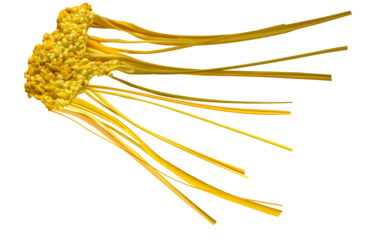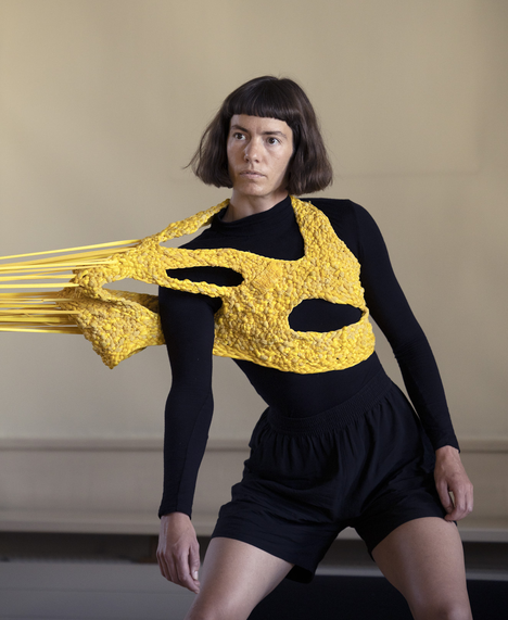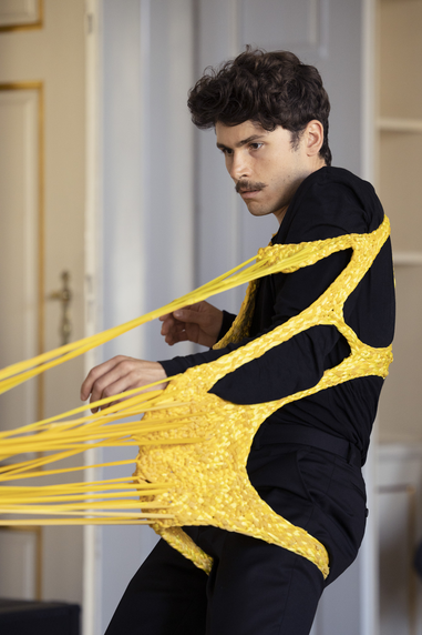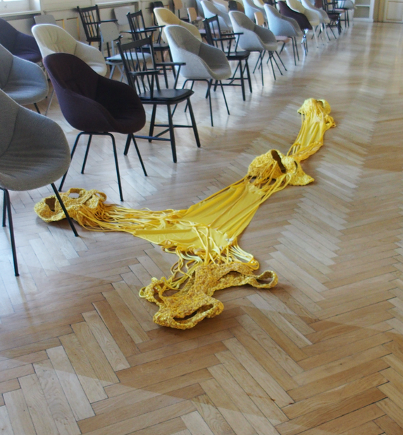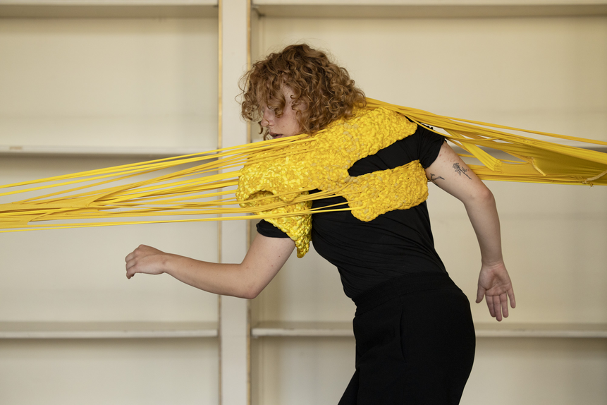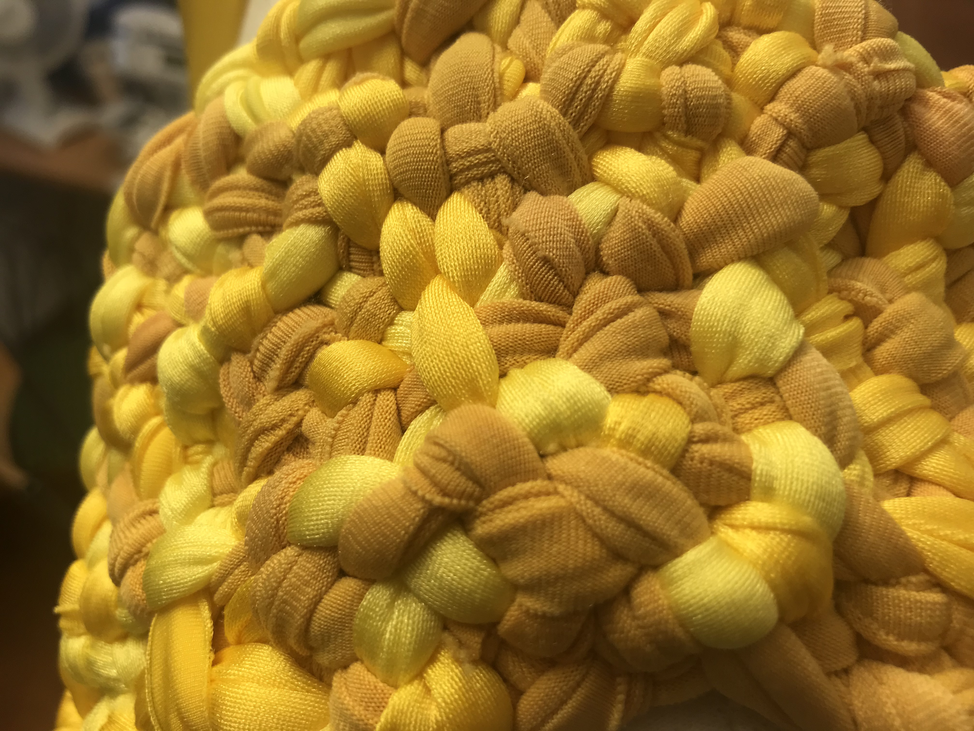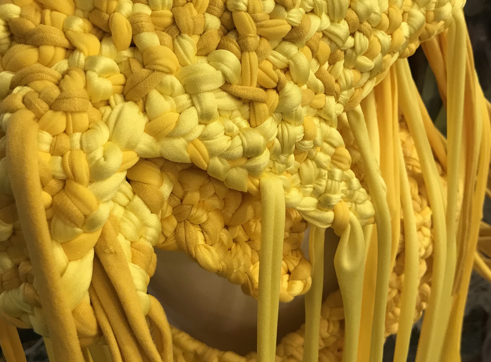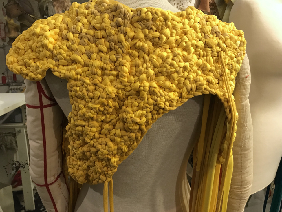 As mentioned, my intention was for the AweAre costume to connect four people. My ambitions were that each of the four wearable parts had subtle references to everyday clothing – having details like a sleeve or a collar – and that each part should appear visually different. As my intention was to develop a crafting technique that made the shape of the wearable part flexible yet stable, the interlocking had to be tighter than the weaving was in the KUV version. Moreover, opposite the KUV version where the weaving as technique was recognizable, my aim was that the interlocking be less visually readable. Hence, my intention was that the interlocking technique sampled weaving with braiding and knotting. As the yellow colour had grown on me and as I had different stretchable and machine knitted textiles – in cotton and polyester fibre combinations – in different shades of yellow in stock, I decided to use them.