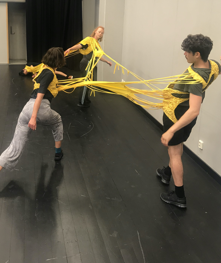 Haraway points to the fact that attending to nuances of the dancers’ experiences was an exercise of attuning my lydhørhed (link) and my ability to listen and respond to them. I also had to exercise and/or explore how I could craft conditions that made the dancers able to listen and respond to each other and to the costume. I needed to attune my response-abilities as a way of gaining knowledge of how the costume affected the dancers in different ways, and as an opening or invitation to the dancers to co-explore the costume and co-create the performance.