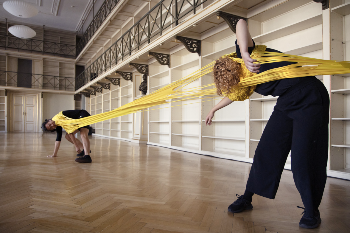 The next day (25 June 2020) we meet at the performance location Det Classenske Bibliotek (Copenhagen, Denmark) where we have one hour to rehearse in the space. We discuss whether the performers shall enter and exit from the same door or from two opposite doors – we decide on the former. The dancers explore the simple dramaturgical score: entering the space, moving to the end of the space, turning and returning to exit from where they entered the space. Before we know it, the hour is over.