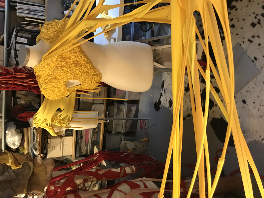 (1) For this KUV (kunstnerisk udviklings virksomhed translates to artistic research) project, Textile Techniques as Potential for Developing Costume Design, (2016/2017) I invited three tailor colleagues (employed) at the Danish National School of Performing Arts to join me. Side by side and in dialogue we (individually) developed several costumes using crafting techniques inspired by braiding. One of my research ambitions was to invite the tailors to make costumes from a perspective different to that of their daily work at the school. As they usually produce costume in collaboration with and from drawings made by scenography students, they never develop their own costume ideas. As I was challenging the tailors, I also wanted to challenge myself. Therefore, I intentionally chose a role of stretchable material that the tailor workshop had stored for years which I did not find particularly inspiring. The textile smelled and its yellow colour was a bit too murky to my taste.